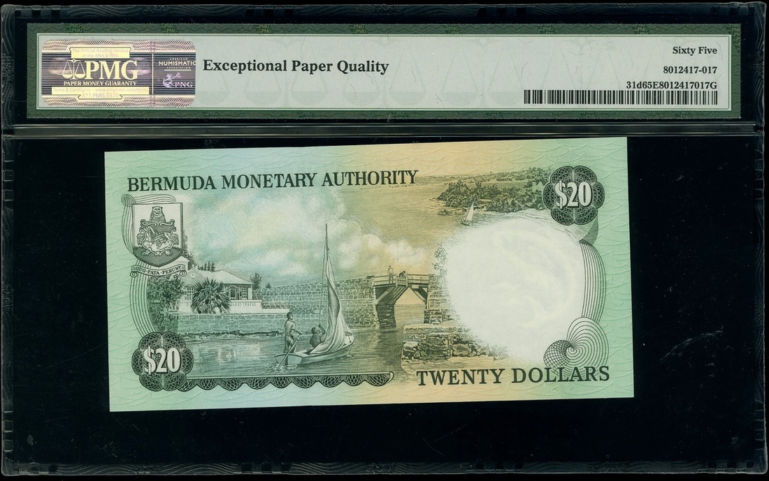1986年百慕達金融管理局20元,細編號A/3000036,PMG 65EPQ