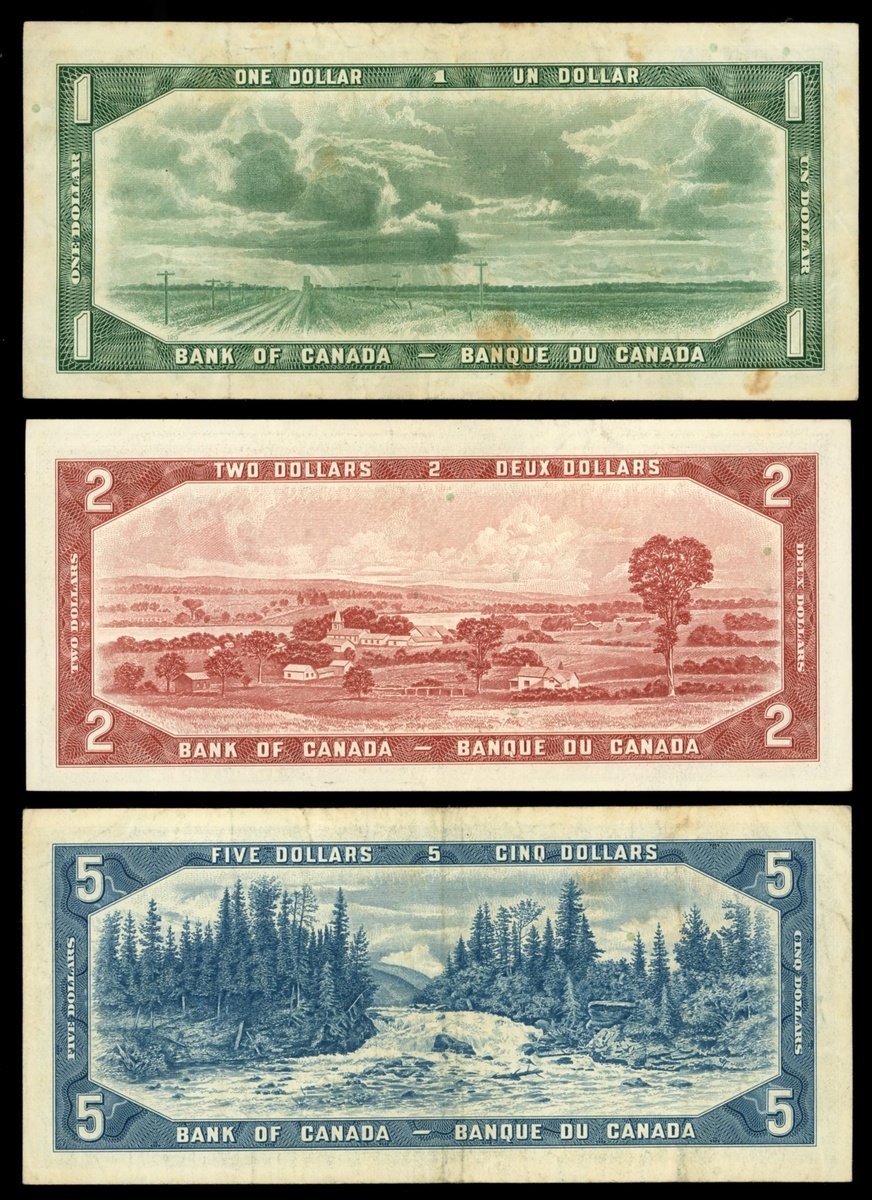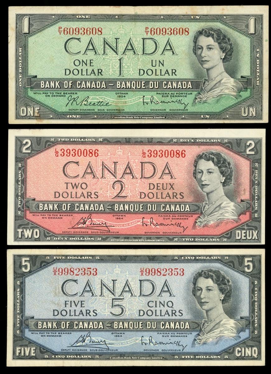 Canada, $1, $2 and $5, 1954, serial numbers P/Y 6093608, L/G 3930086 and U/X 9982353, (Pick 74b, 76c, 77c), about very fine (3)