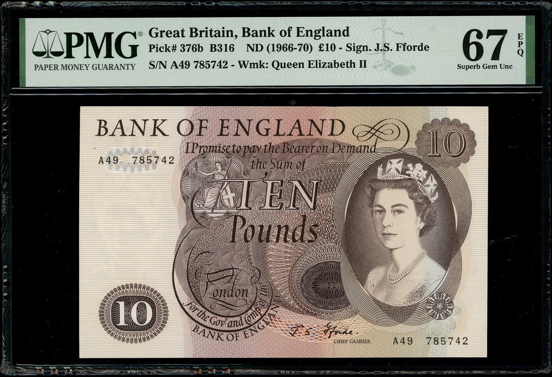 Bank of England, £10, ND (1966-1970), serial number A49 785742, (Pick 376b), PMG 67EPQ Superb Gem Uncirculated