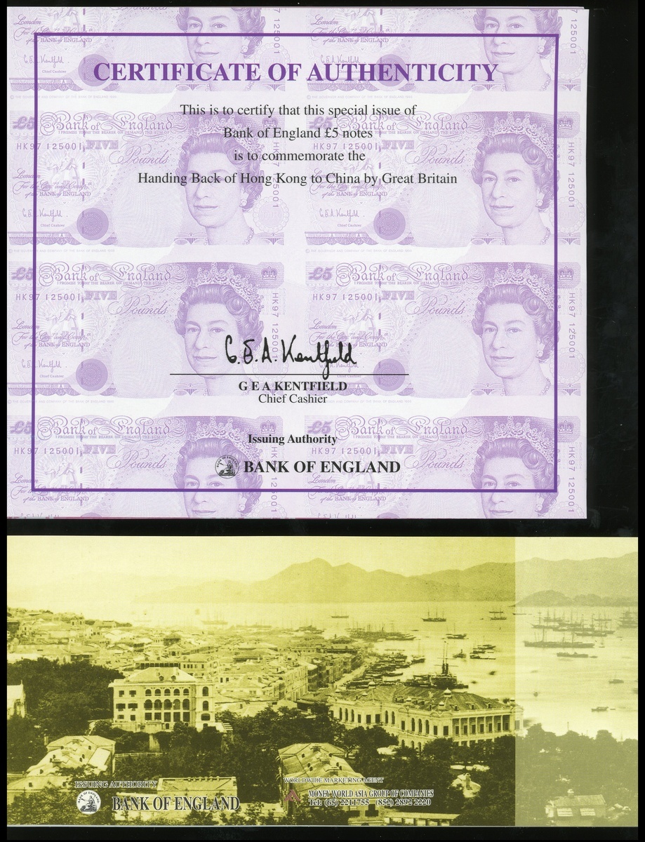 1997年英倫銀行香港回歸紀念鈔5鎊一對,連號 HK97 905027及HK97 905028,均UNC,連原裝封套
