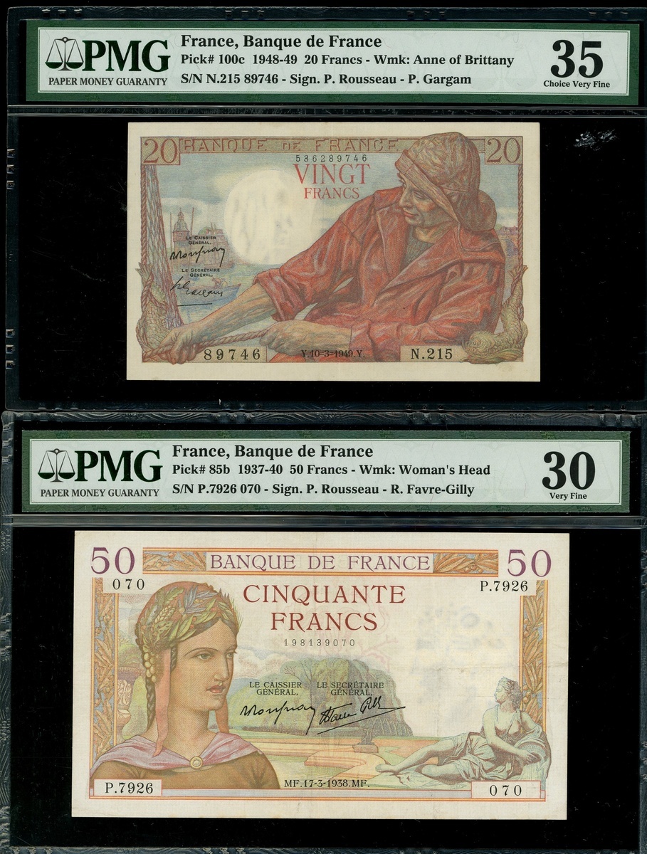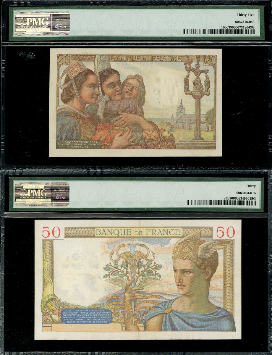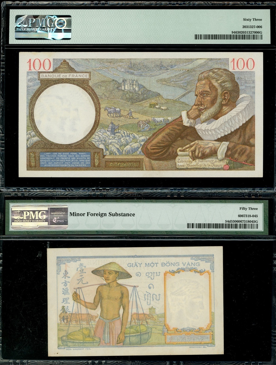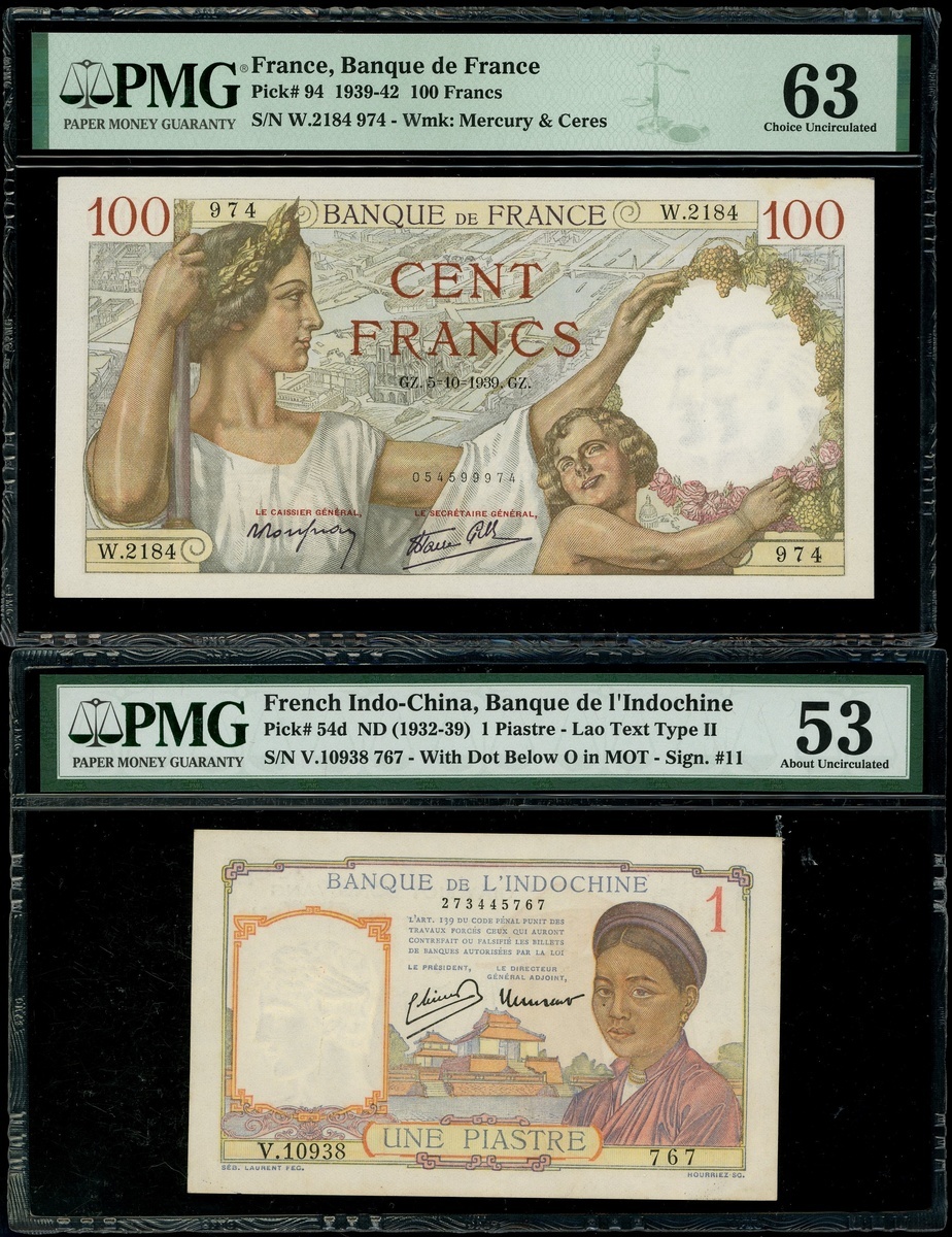 法國一組4枚,包括1949年20法郎,1938年50法郎及1939年100法郎,及法屬安南1元(無日期),編號N.215 89746,P.7926 070,W.2184 974及V.10938 767,分別評PMG 35,30,63及53(輕微外附物)