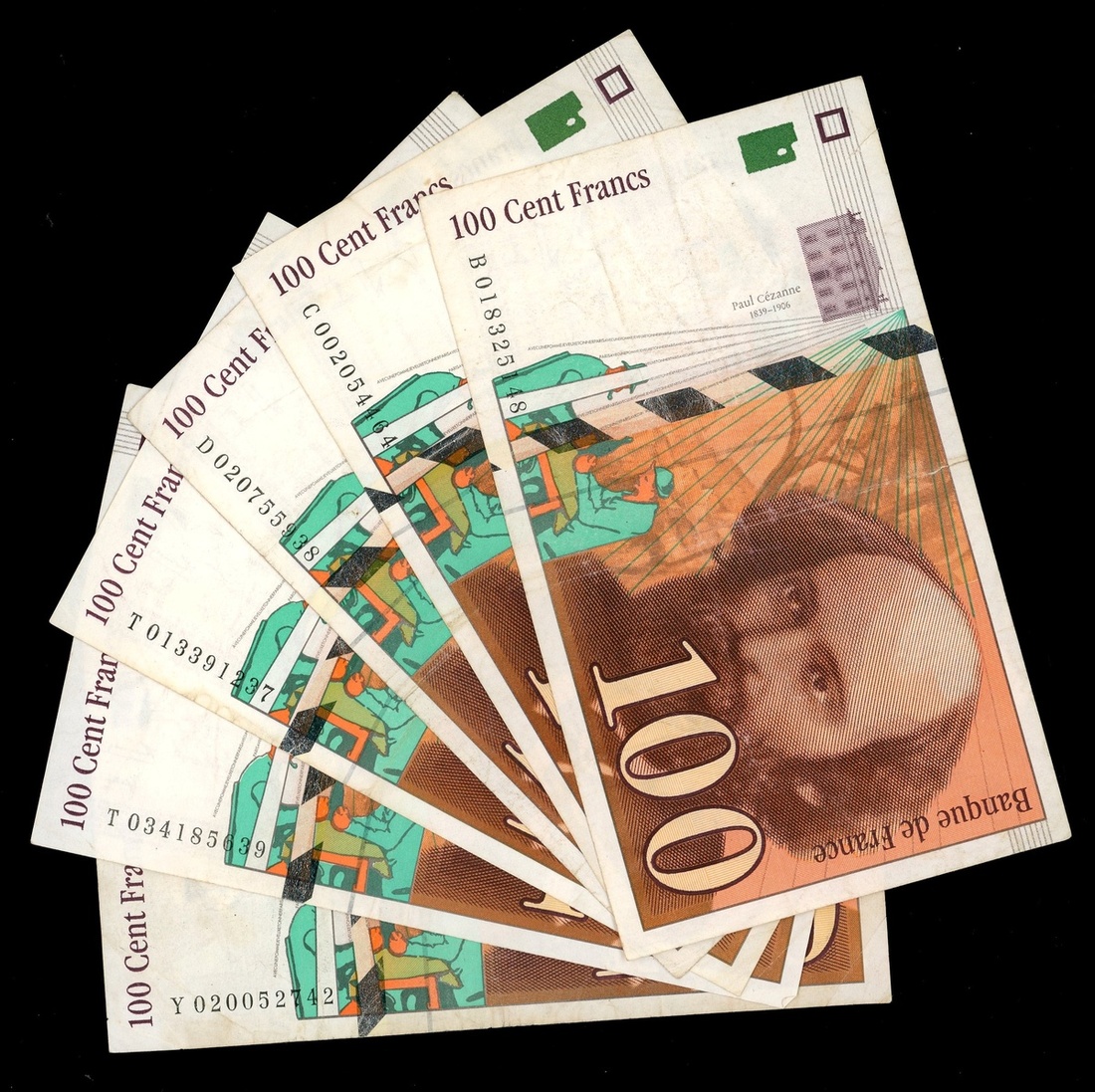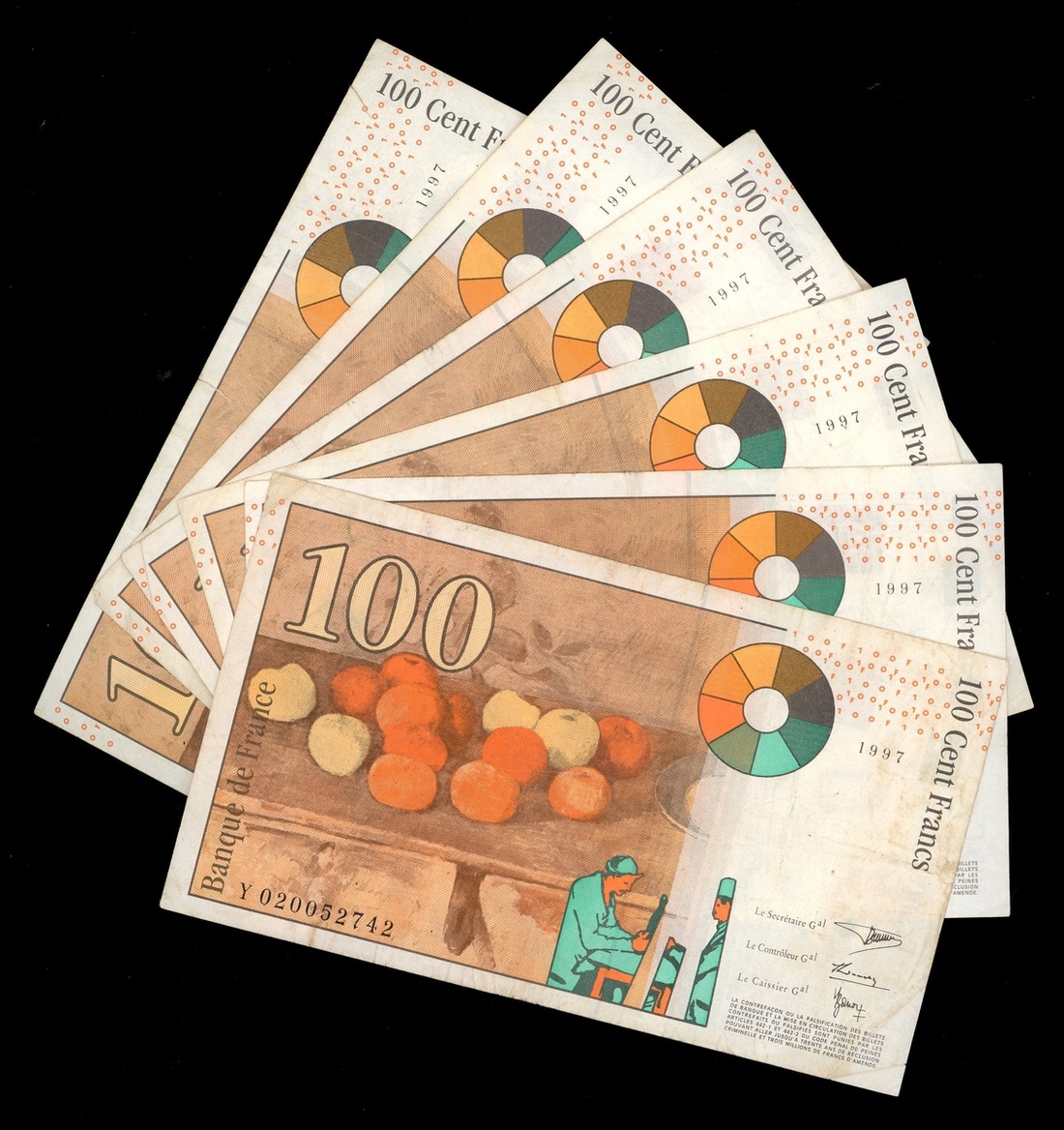 1997年法蘭西銀行100法郎一組5枚,編號B018325148,C002054464,D020755938,T013391237,T034185639及Y020052742,AVF品相,若干有細孔