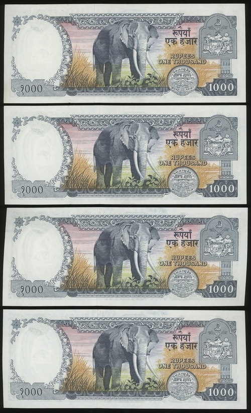 1981年尼泊爾一組7枚,包括20盧比1枚,100盧比2枚,及1000盧比4枚,均為Adhikary署名,2枚1000盧比有釘孔,近乎AU品相,其餘AU至UNC