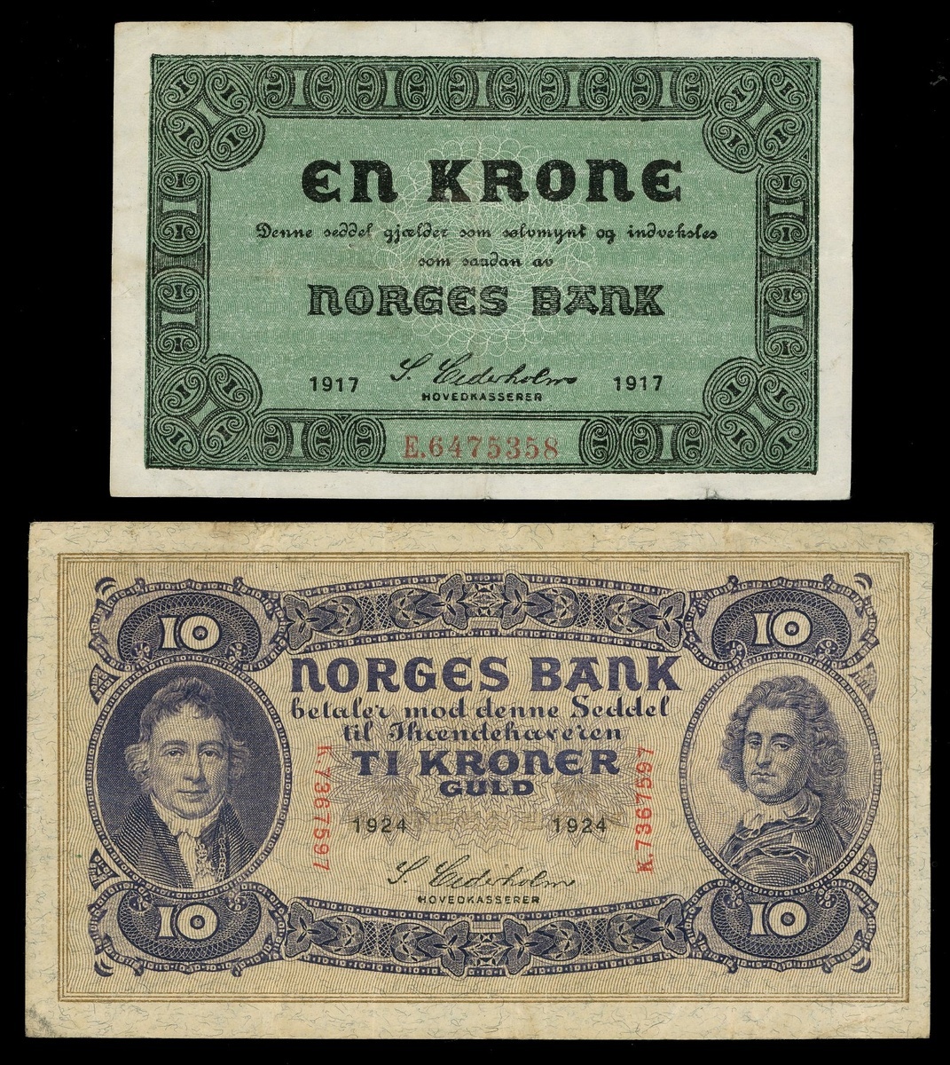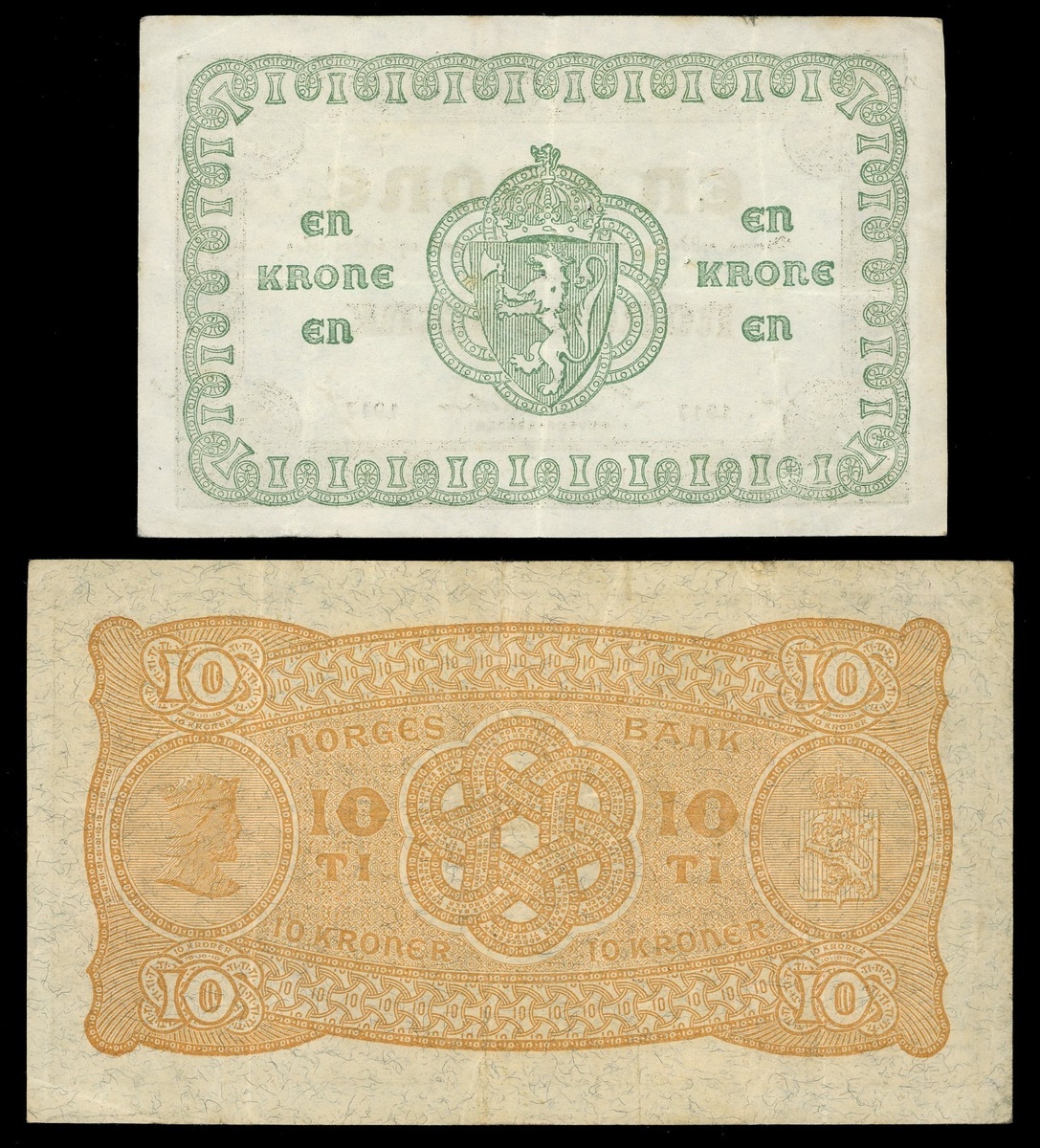 挪威1917年1克朗及1924年10克朗,編號E.6475358及K.7367597,均S.Cederholm署名,VF品相