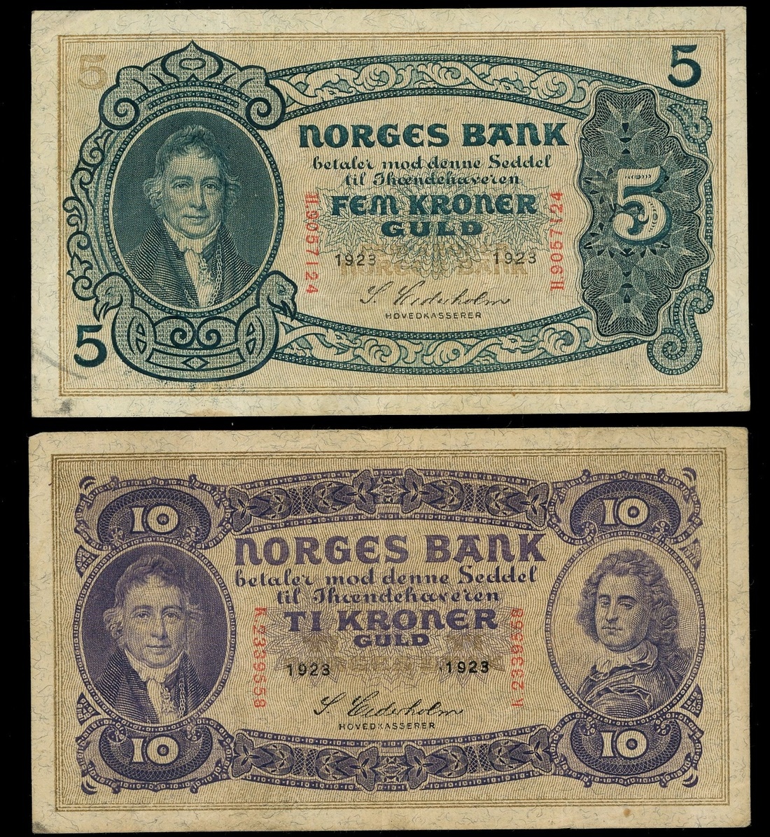 Norway, a pair of 5 and 10 Kroner, 1923, serial numbers H.9067124 and K.2339558, both signed by S. Cederholm,
