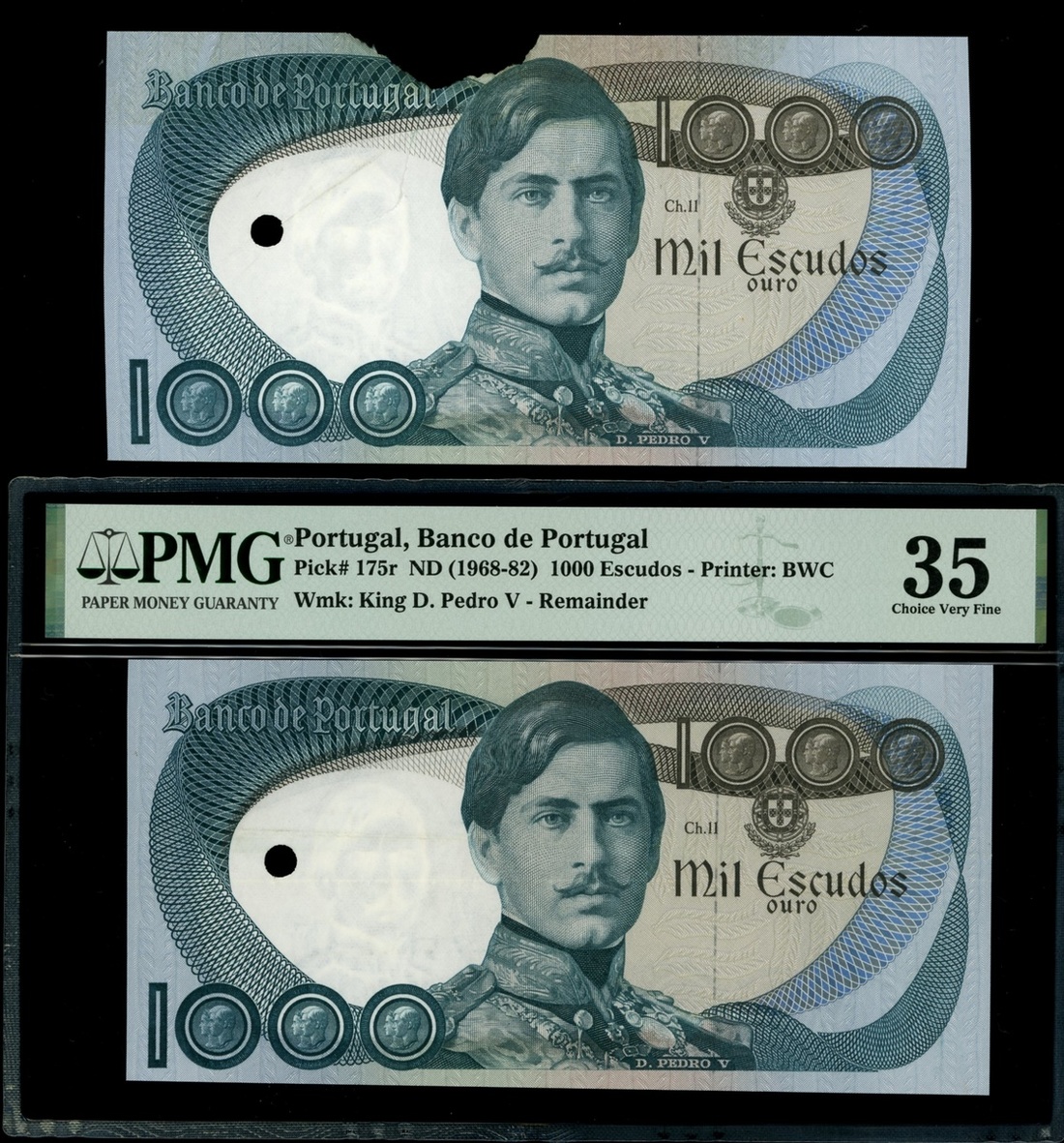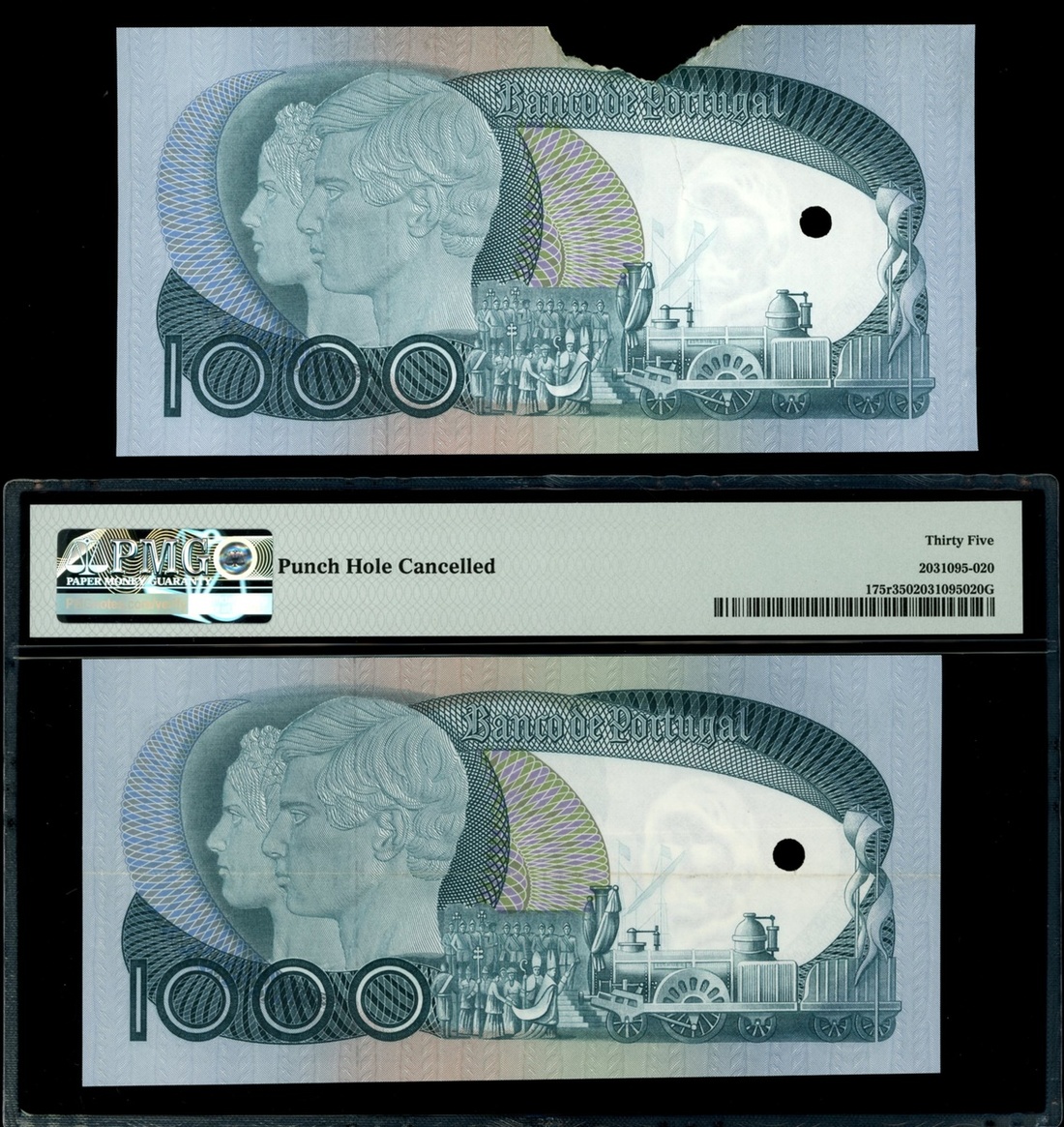 1968-1982年葡萄牙銀行1000埃斯庫多庫存票一對,無日期,一枚評PMG 35(打孔注銷),另一枚上方紙邊有缺,近乎UNC品相