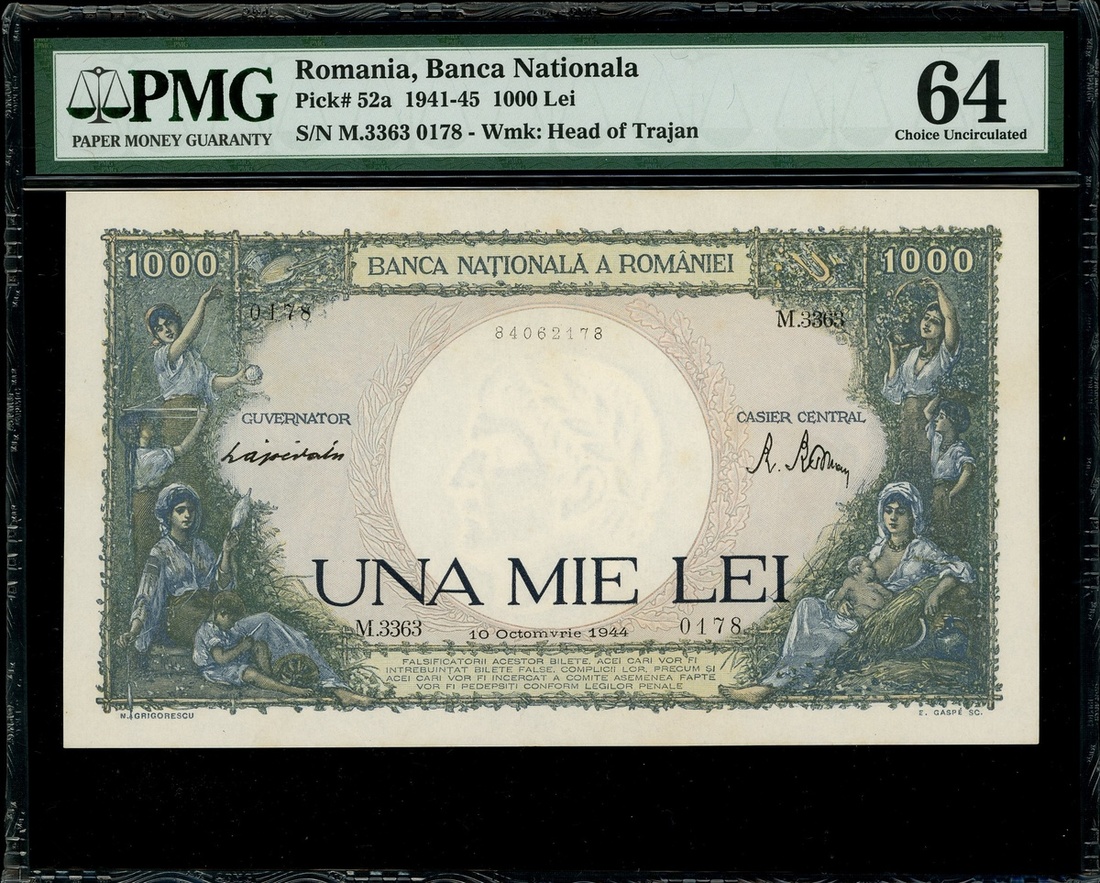 Romania, 1000 Lei, 10.10.1944, serial number M.3363 0178, (Pick 52a), PMG 64 Choice Uncirculated.