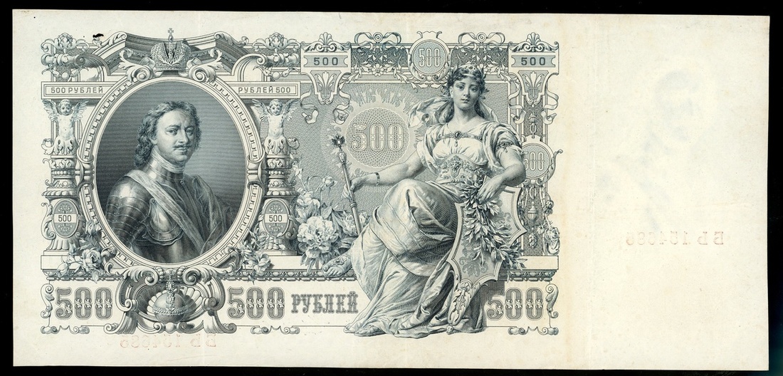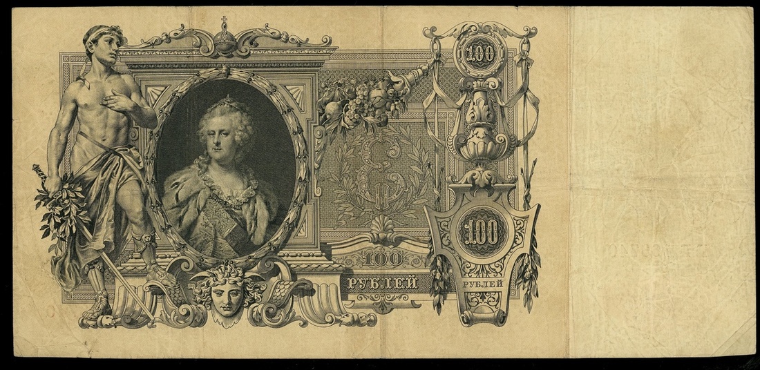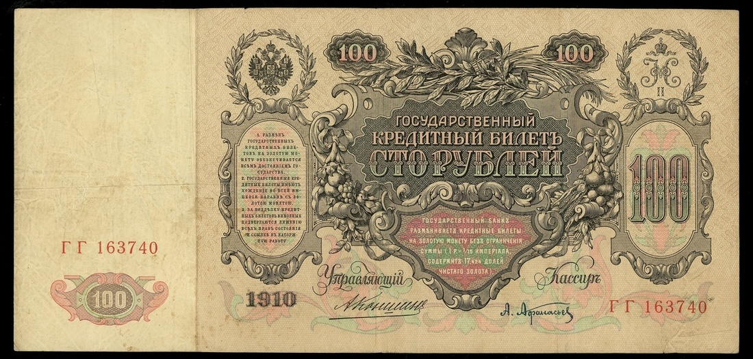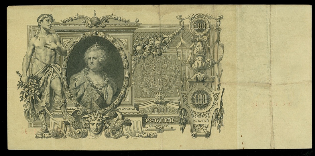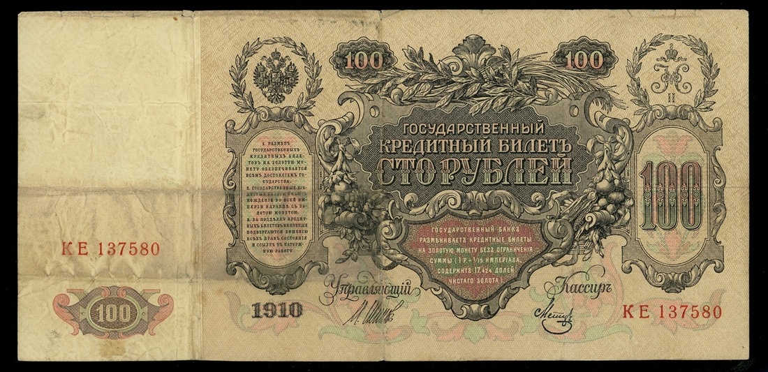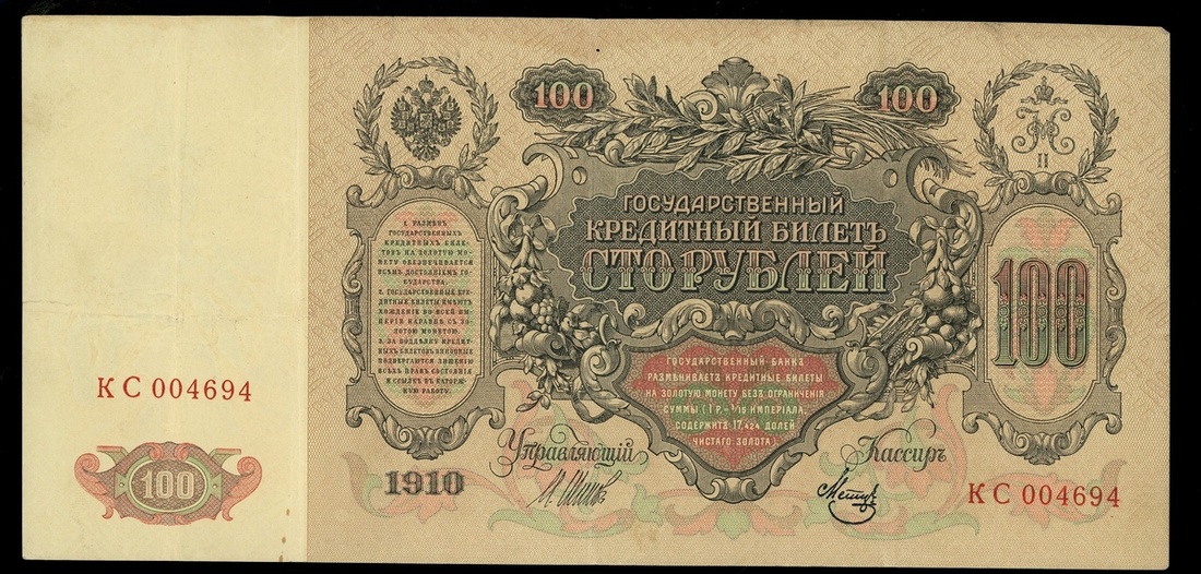 俄羅斯一組5枚,包括1910年100盧布4枚,及1912年500盧布1枚,編號KC004696,KC158858,KE137580,LL1637401及bb154685,VF品相