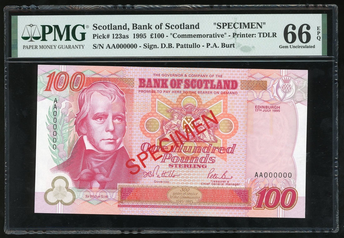 Bank of Scotland, 100 pound, specimen, 19.5.1999, serial number AA000000, commemorative for 300 years of service (1695-1995), (Pick 123cs), PMG 66EPQ Superb Gem Uncirculated