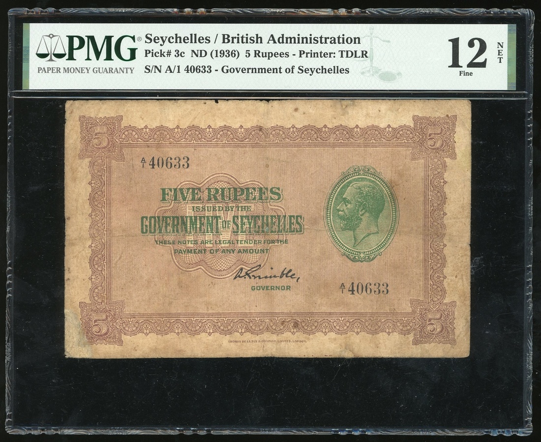 Seychelles, 5 Rupees, ND (1936), serial number A/1 40633, (Pick 3c), PMG 12NET Fine (Repaired, Pieces Added).
