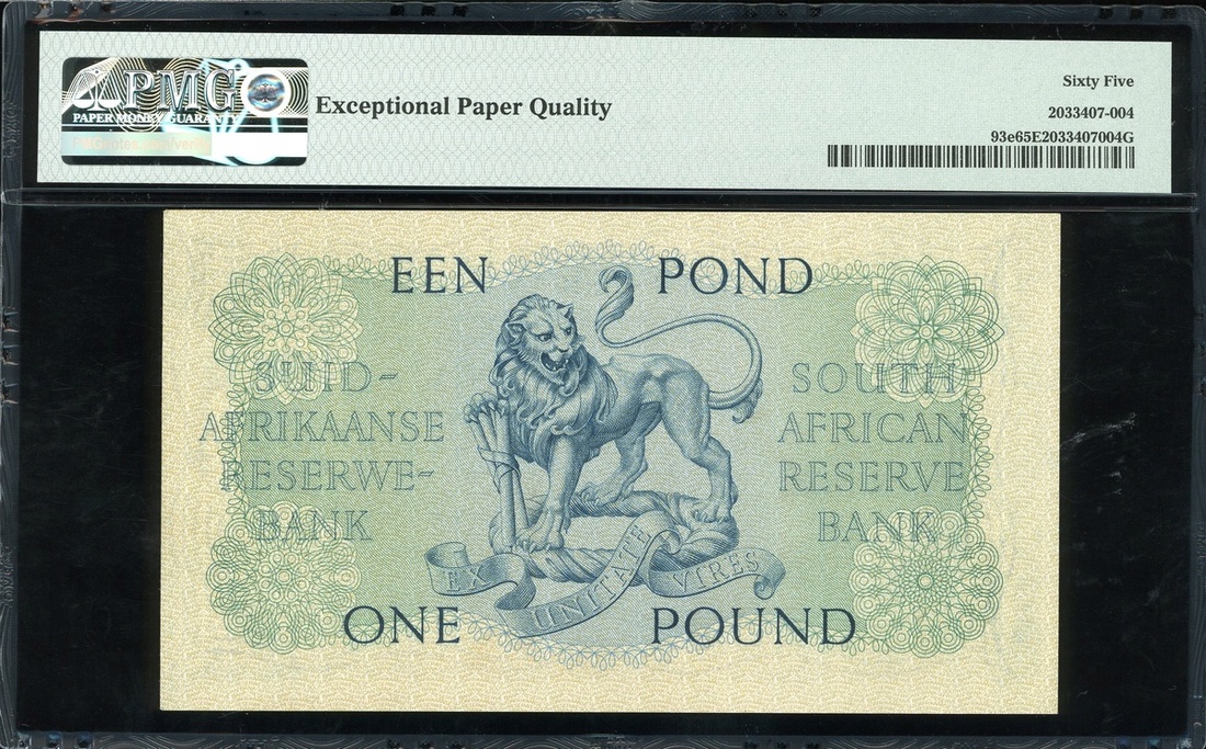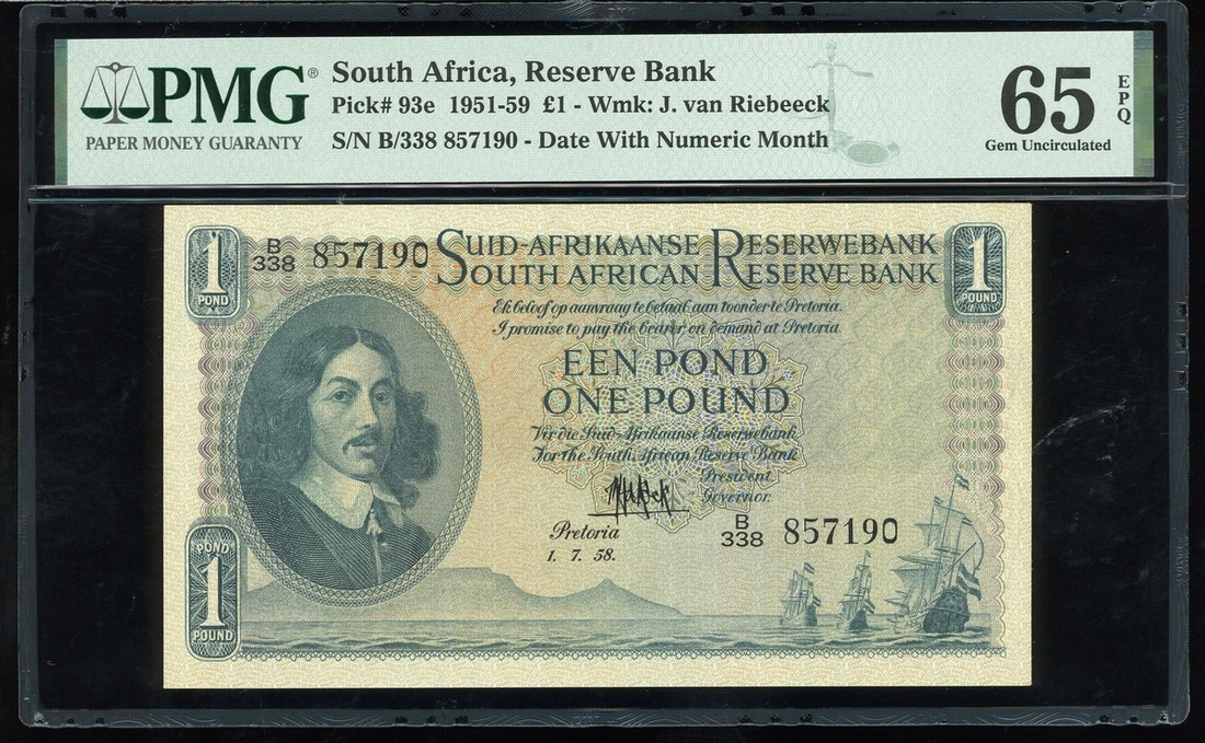 1958年南非儲備銀行1鎊,編號B/228 857190,PMG 65EPQ