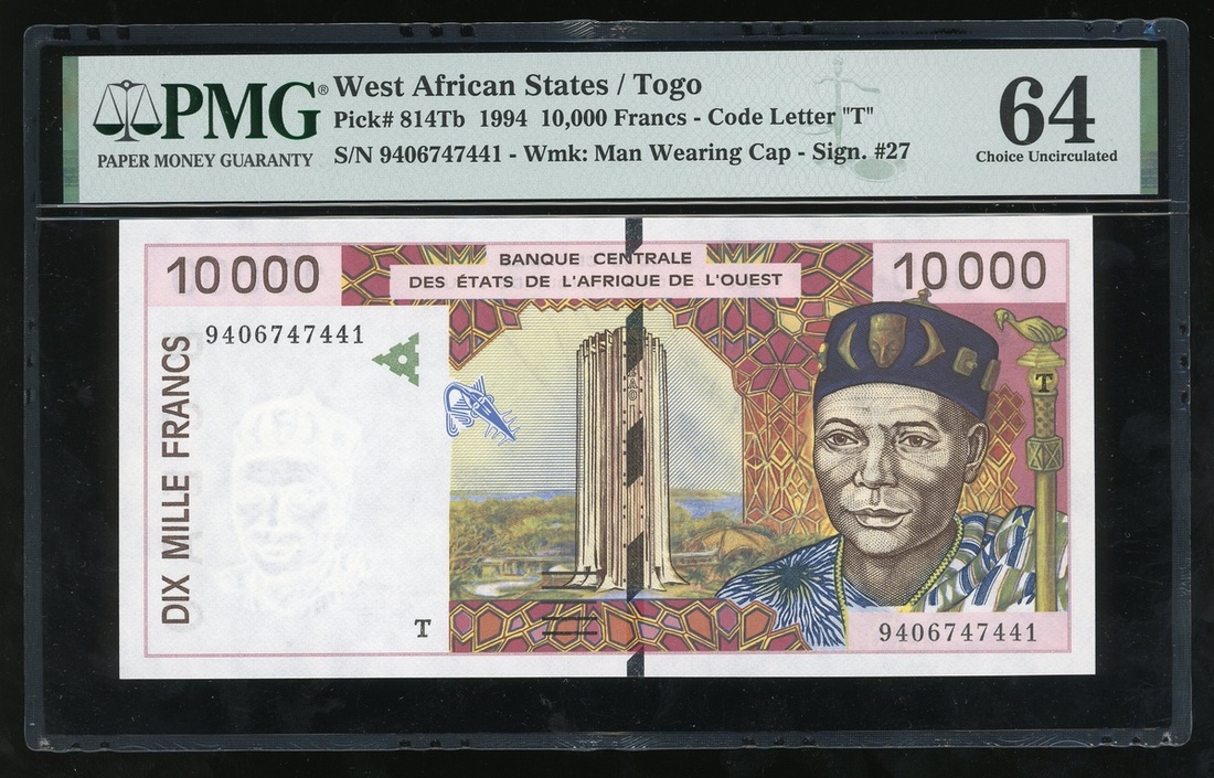 Togo, West African States, 10,000 Francs, 1994, serial number 9406747441, (Pick 814Tb), PMG 64 Choice Uncirculated.