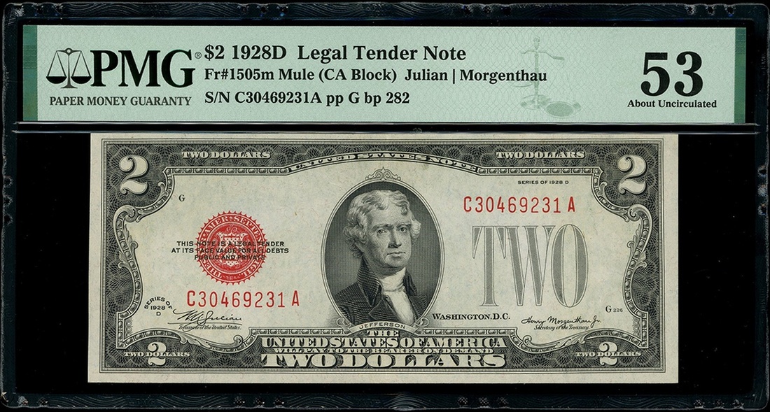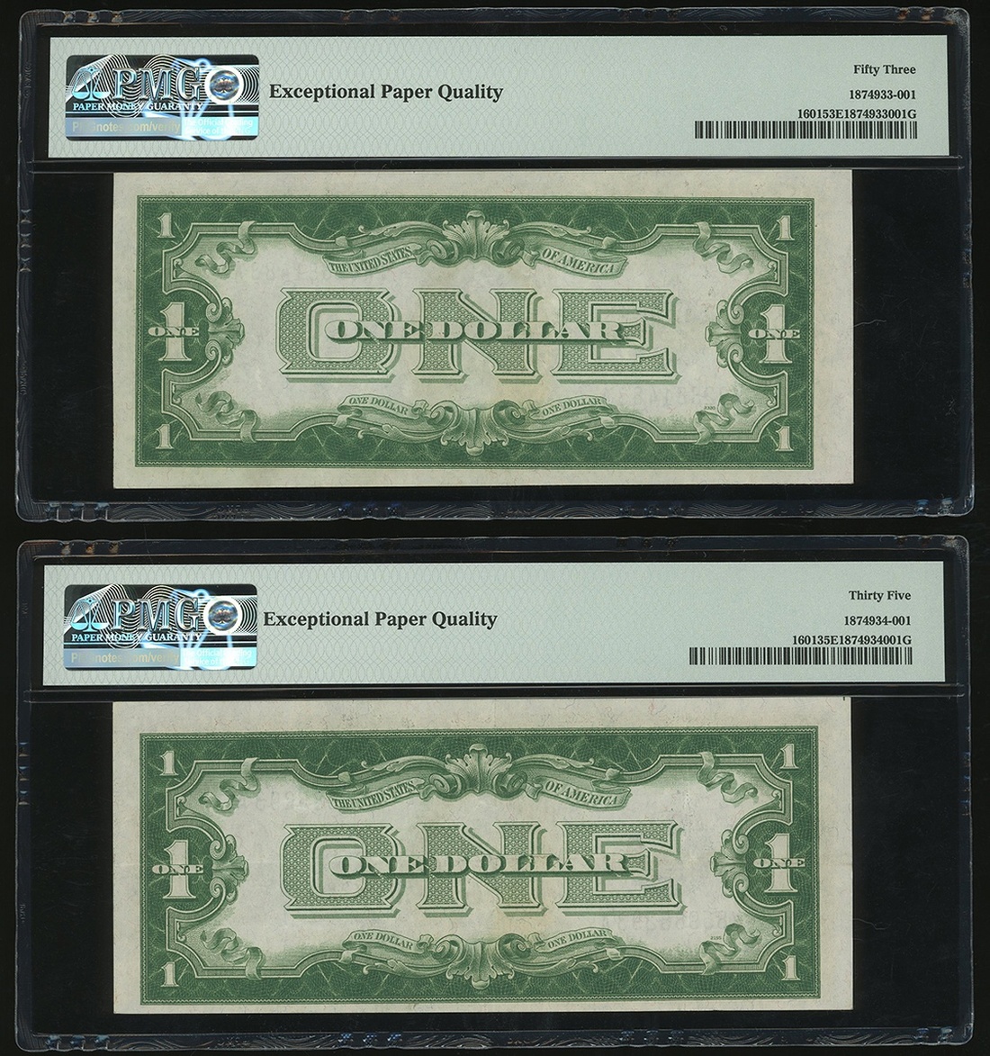 美國紙鈔一組3枚,包括:1928A銀幣券1元2枚,編號V85985293A及W02881483A,及1928D2元,編號C30469231A,分別評PMG 35EPQ,53EPQ及53