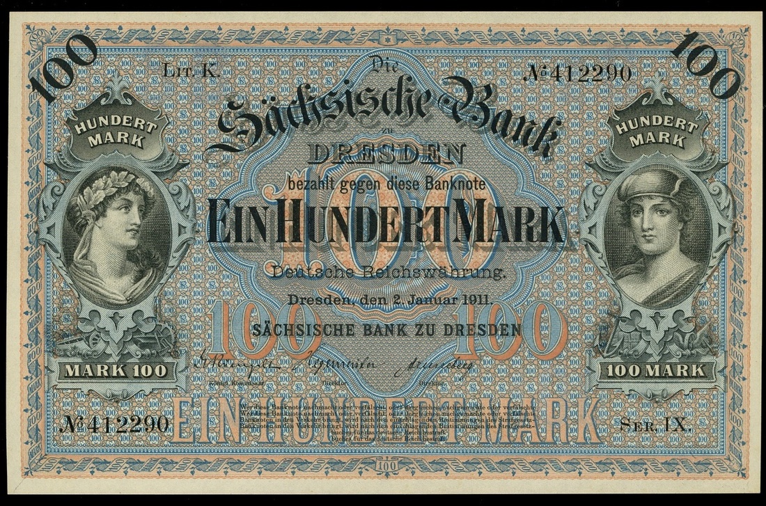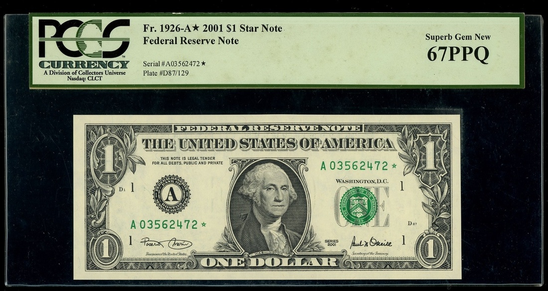 United States, $1, 2001, star note A03562472*, and also Saxony, 100 Mark, 1911, serial number 412290,