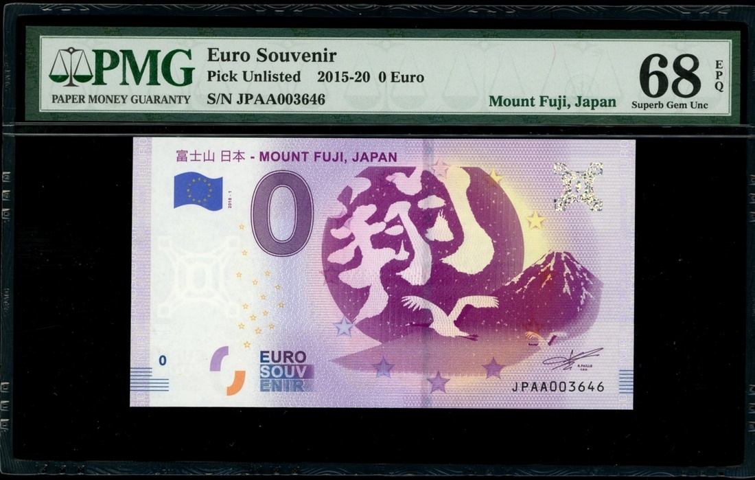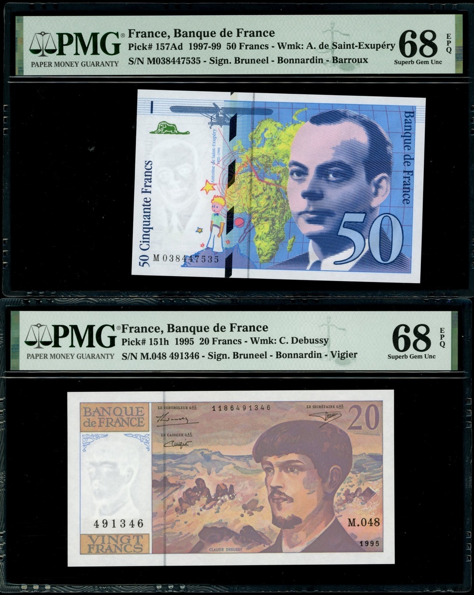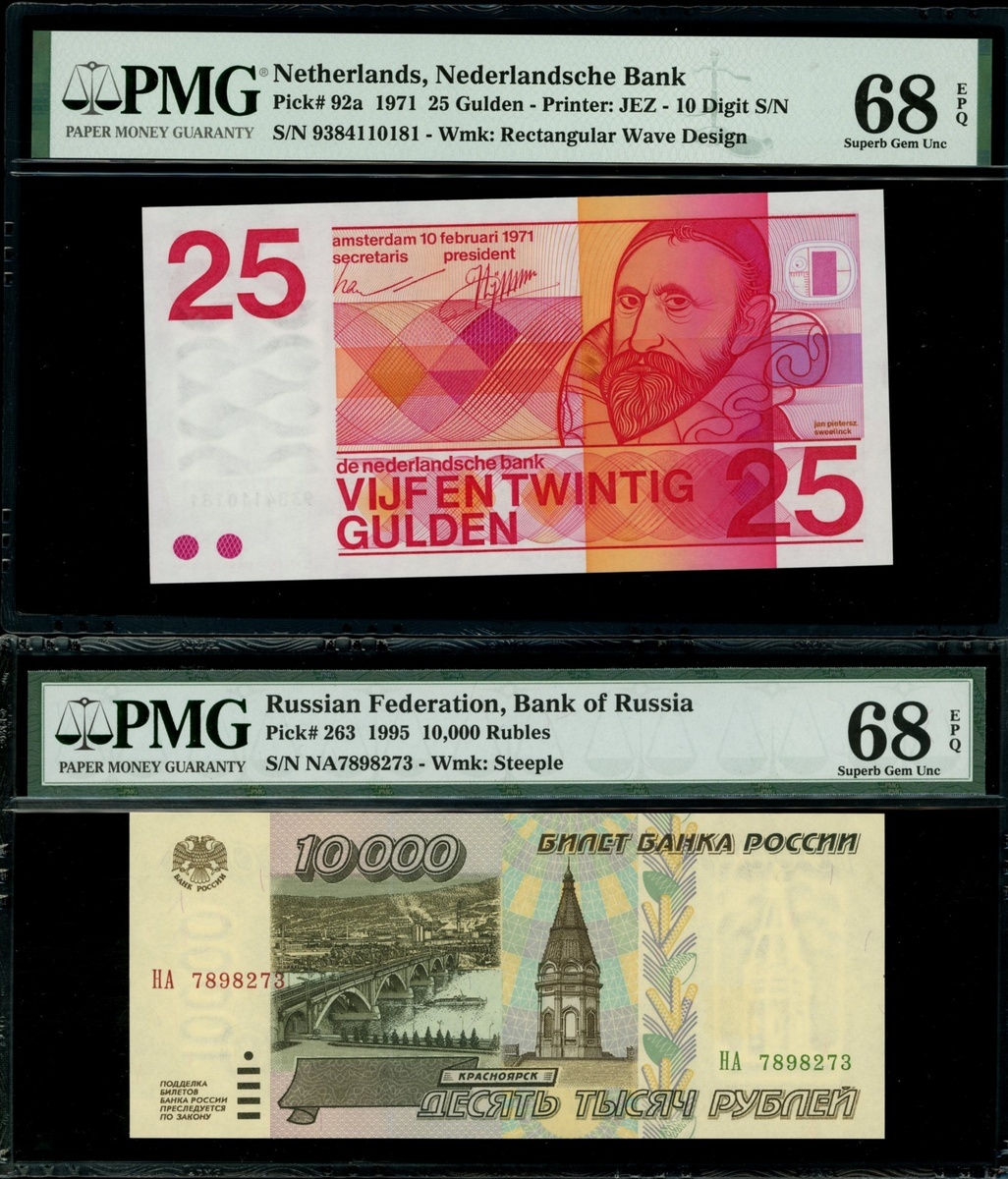 世界紙鈔一組8枚,包括1968及1997年荷蘭10盾,1971年25盾,1995年俄羅斯10,000盧布,2018年挪威500克朗,法國1995年20法郎,1997年50法郎,及2018-1歐元紀念品「0歐元紀念鈔」,PMG 68EPQ至69EPQ,一組高分美品