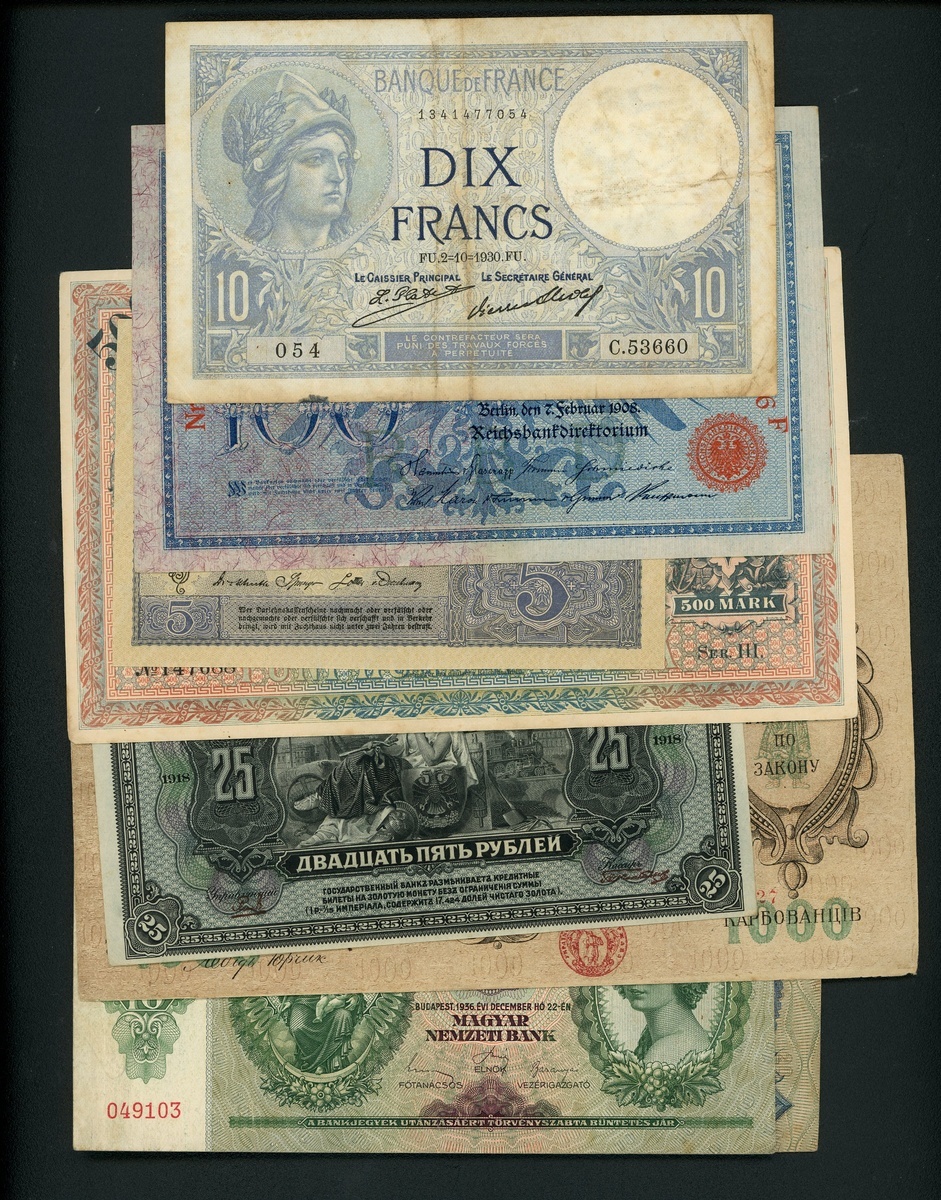 World Banknotes, group of 8, consisting of: 1x France, 10 Francs, 2.10.1930, 3x Germany, 5 and 100 Mark, 1917 and 1908, 500 Mark, Dresden, 1922, 2x Russia, 25 Rubley, 1918 and 1000 Karbovanets, ND, and 2x Hungary, 10 and 20 Pengo, 1936 and 1941,