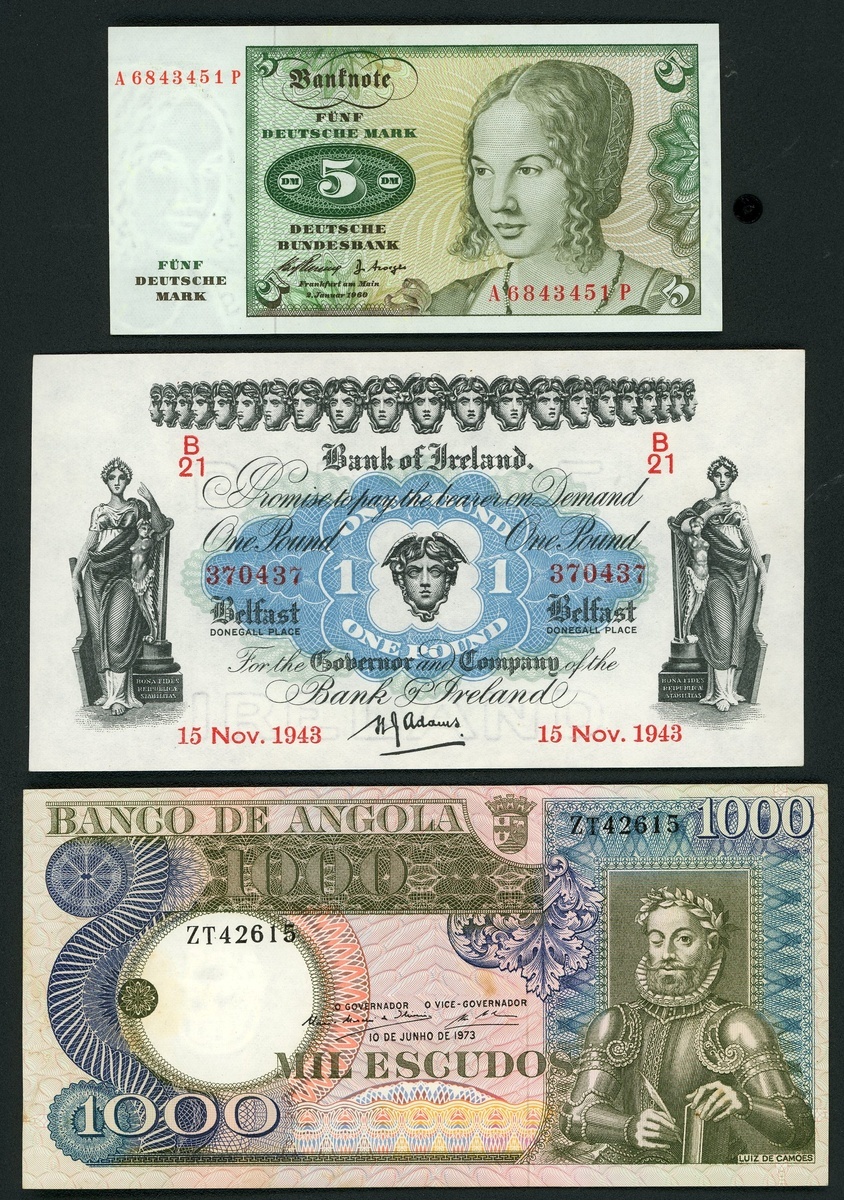 World Banknotes, group of 3, consisting of: Germany, 5 Mark, 1960, serial number A6843451P, Ireland, £1, 1943, serial number B/21 370437 and Angola, 1000 Escudo, 1973, serial number ZT42615,