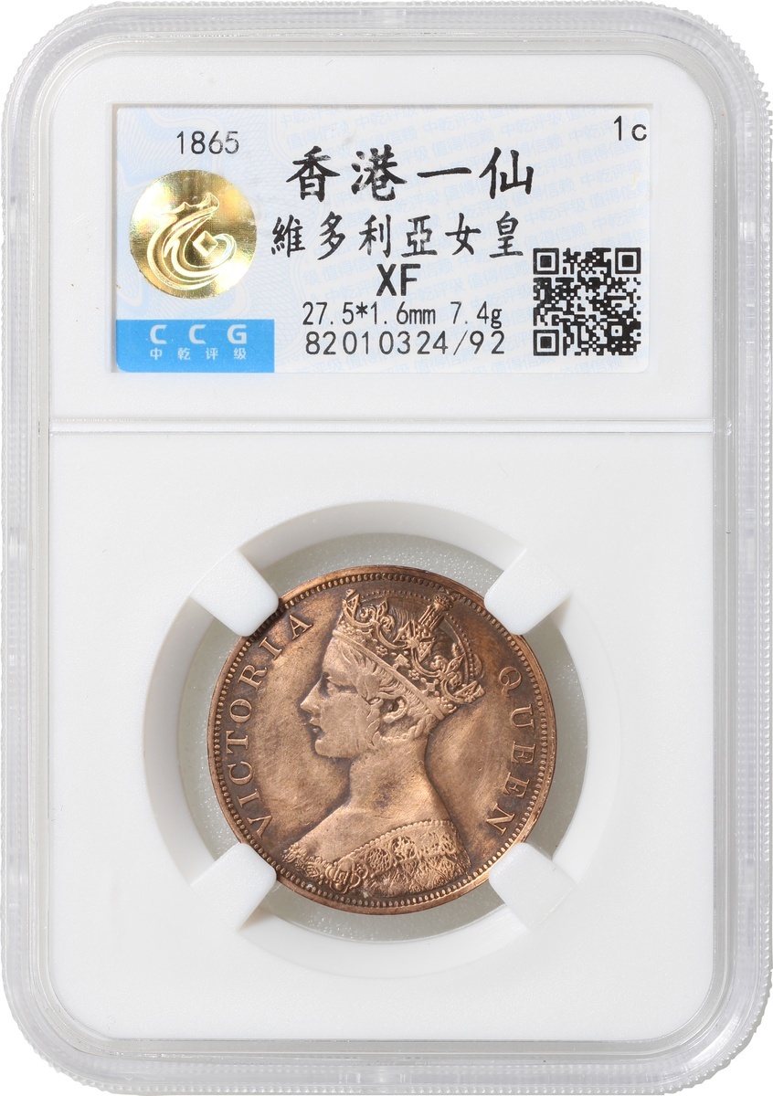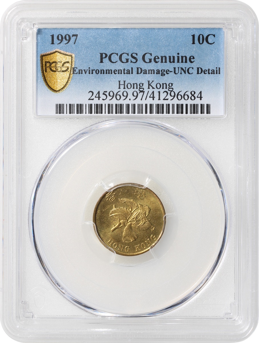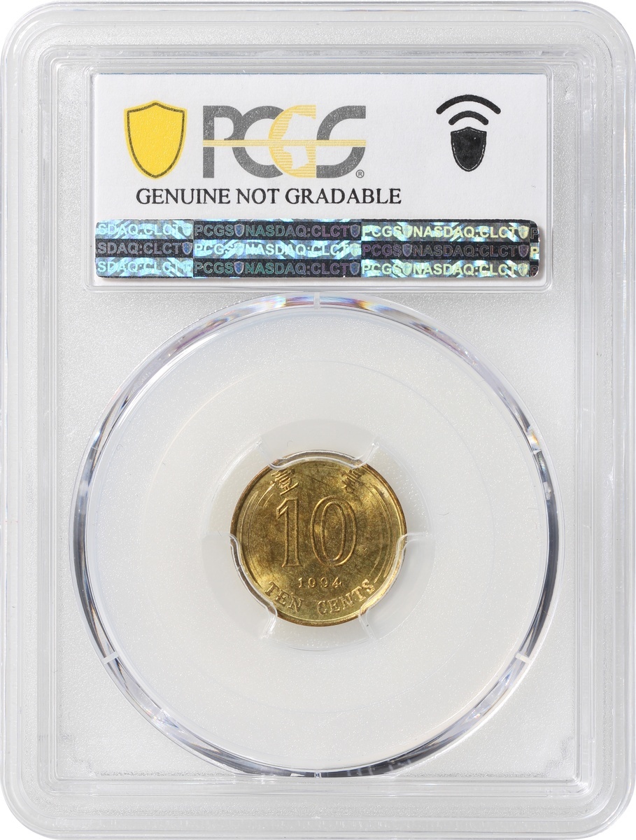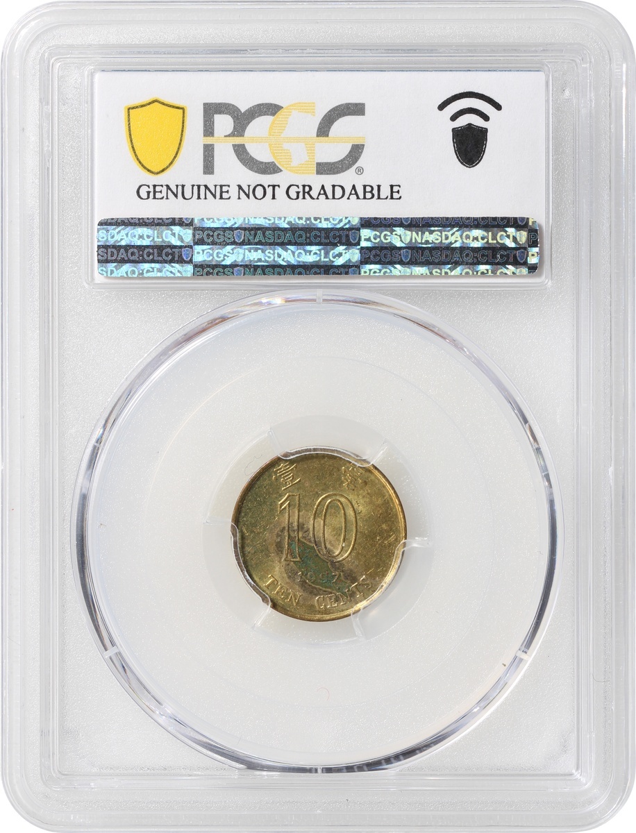 Hong Kong, group of 3, consisting of 1x bronze 1 cent, 1865, Victoria at obverse, also 2x nickel brass 10 cents, 1994 and 1997, the first graded Zhong Qian XF, the remaining two graded PCGS Genuine Weap Machine Damage - UNC Detail and Genuine Environmental Damage - UNC Detail respectively, #82010321/92, #41296685 and #41296684 (3).