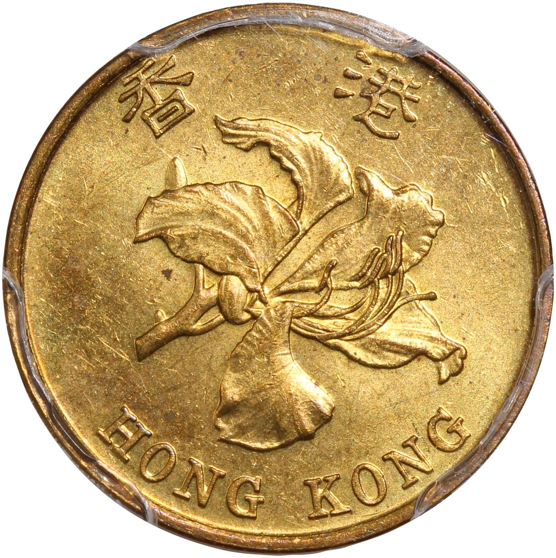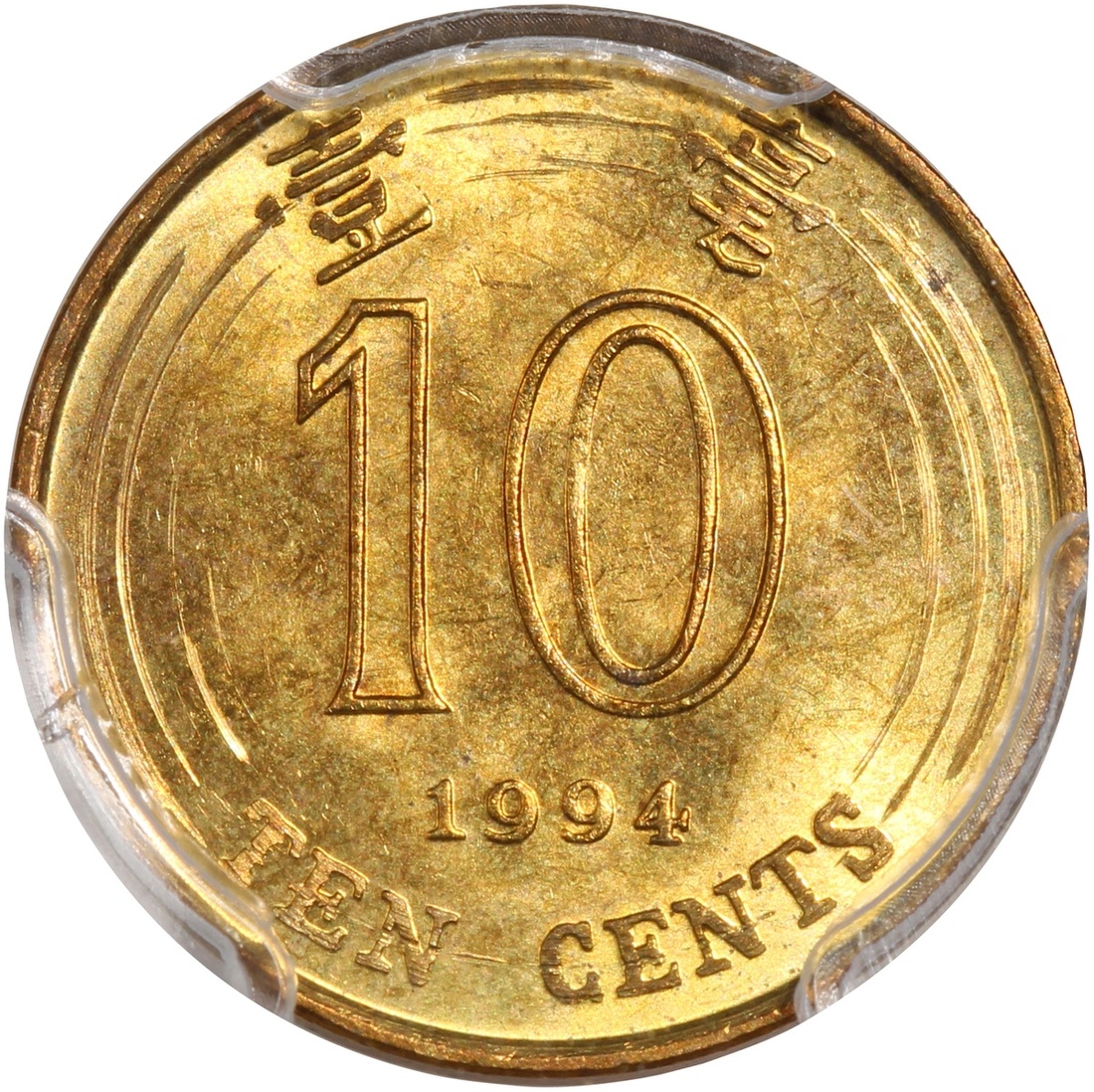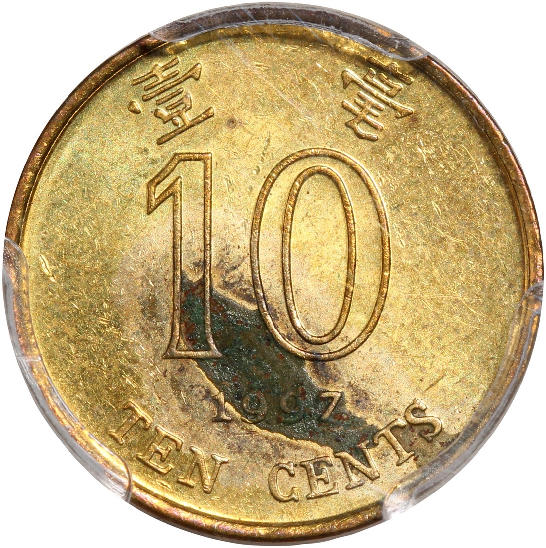 Hong Kong, group of 3, consisting of 1x bronze 1 cent, 1865, Victoria at obverse, also 2x nickel brass 10 cents, 1994 and 1997, the first graded Zhong Qian XF, the remaining two graded PCGS Genuine Weap Machine Damage - UNC Detail and Genuine Environmental Damage - UNC Detail respectively, #82010321/92, #41296685 and #41296684 (3).