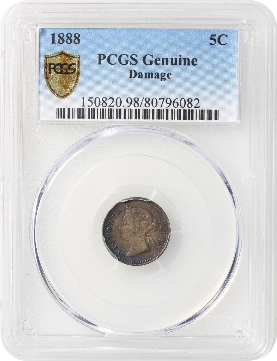 Hong Kong, silver 5 cents, 1888, Victoria on obverse, dark toned, PCGS Genuine, damage. #80796082