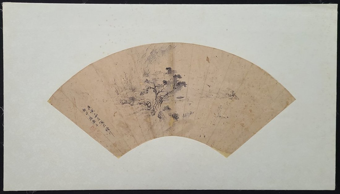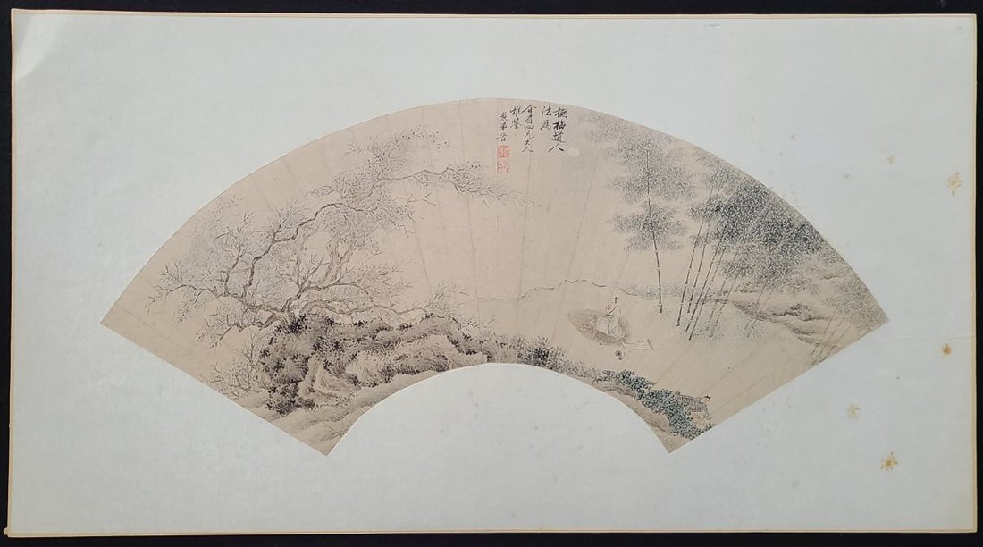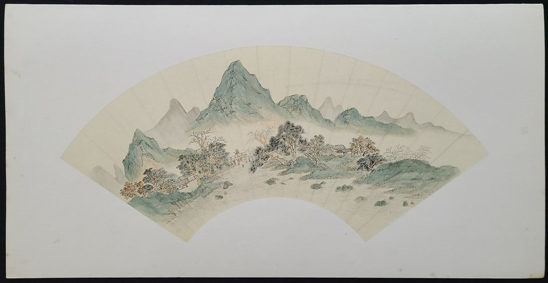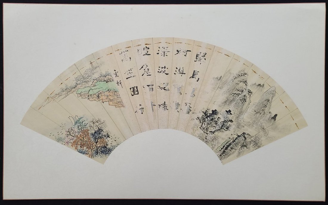1900-1960年代畫家山水人物扇面八幅及果鳥畫鏡心两幅, 畫家包括任薰(款), 黄淦, 蔣祖蔭, 䍩廬及孫藏五等. 品相不一. 扇面尺寸: 每幅約23x53cm, 鏡心畫幅每幅27.5x33.5
