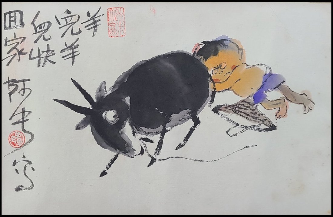 1970-80年代阿虫水墨畫 "羊兒羊兒快回家", 鈐印: "蟲" 及"蛀米大蟲". 己裱, 畫幅尺寸19x29cm