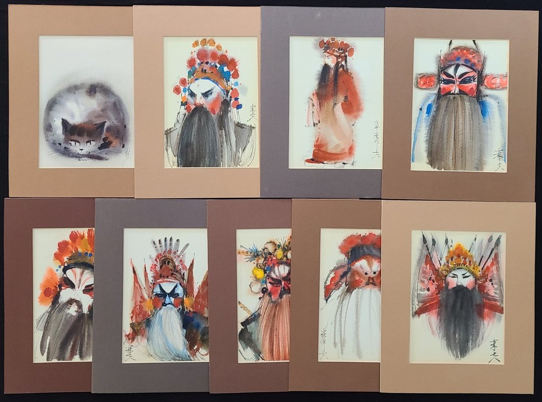 1970年代香港畫家羅偉顯 (山林) 繪小品畫 "京劇人物"八幅及"貓" 一幅. 畫面尺寸: 每幅12.5x17.5cm