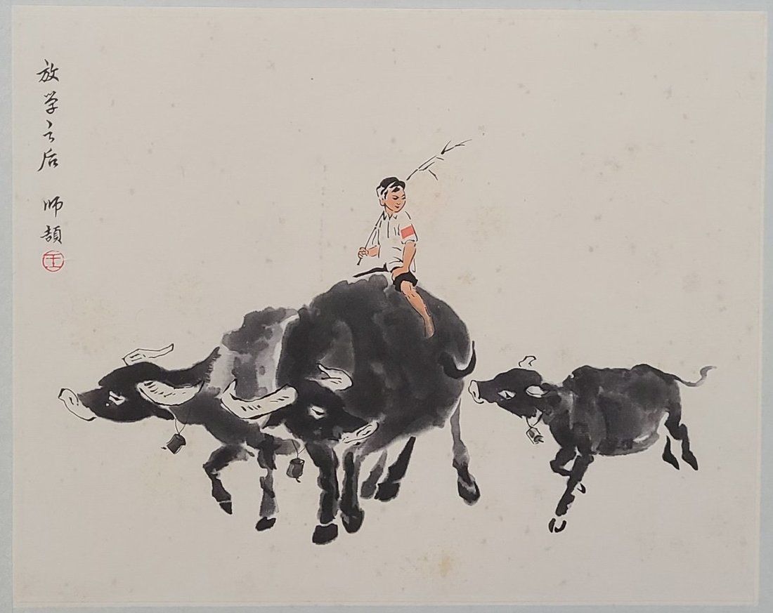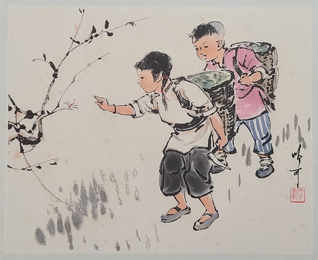 1970年代中國木刻水印畫三幅, 紙本套色: 1/ "山姑娘" 楊以光繪, 畫面尺寸: 25x30cm ; 2/ "放學之後" 王師頡繪, 畫面尺寸: 24.5x30.5cm ; 3/ "捉蜻蜓" 吟可畫, 畫面尺寸: 24.5x30.cm