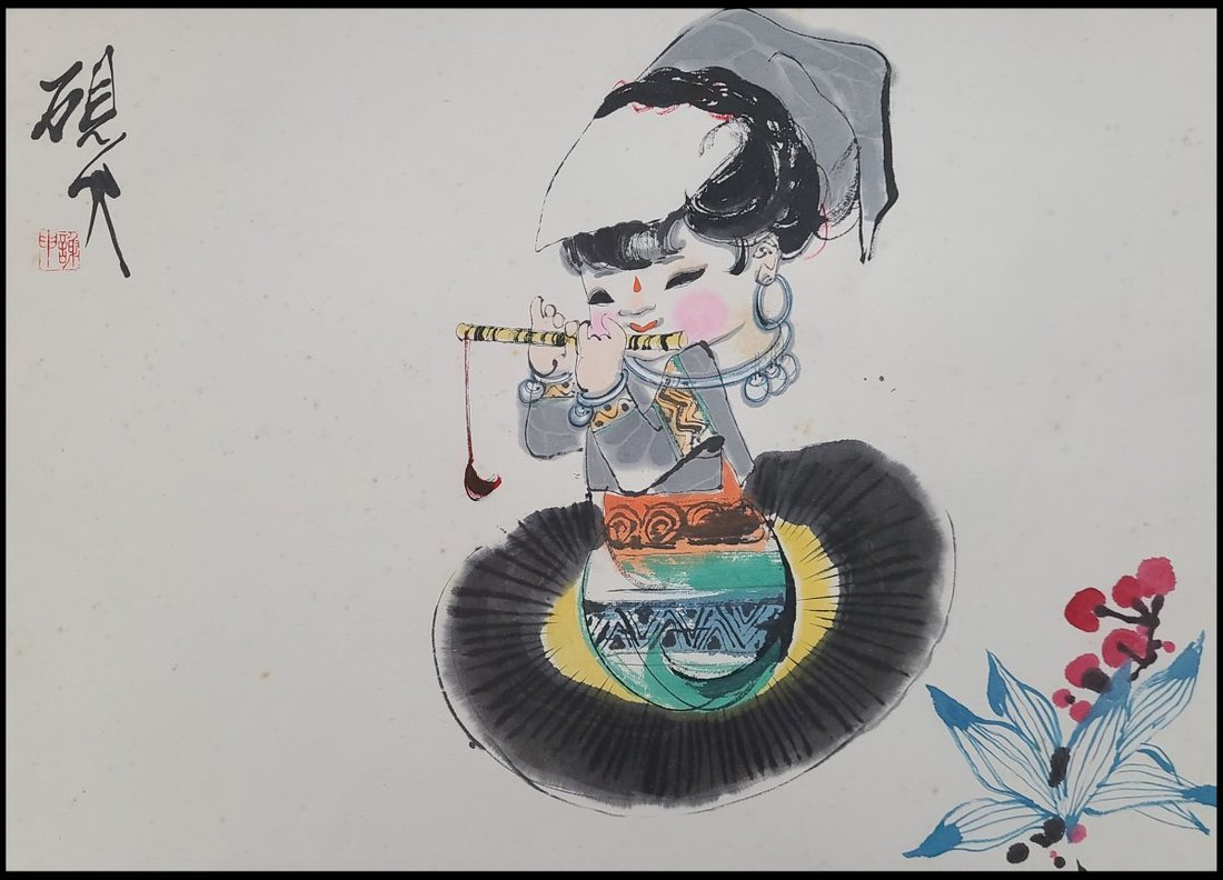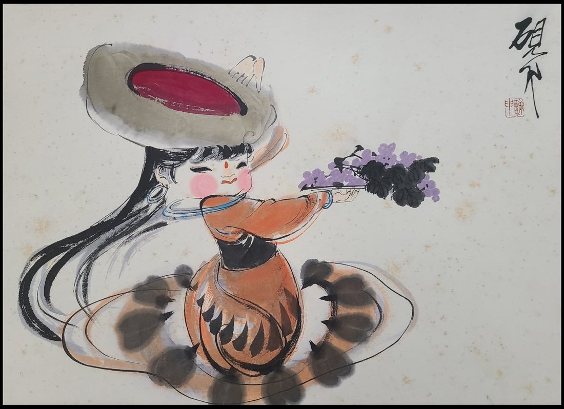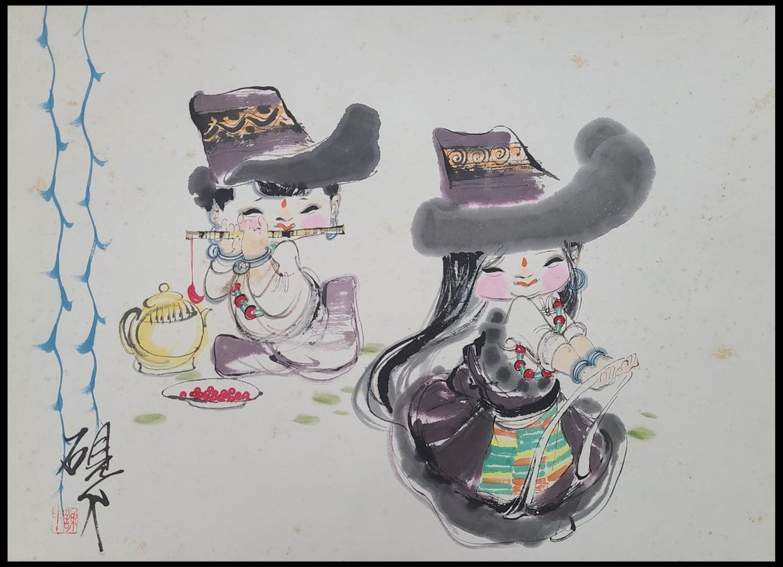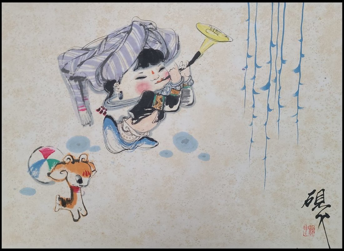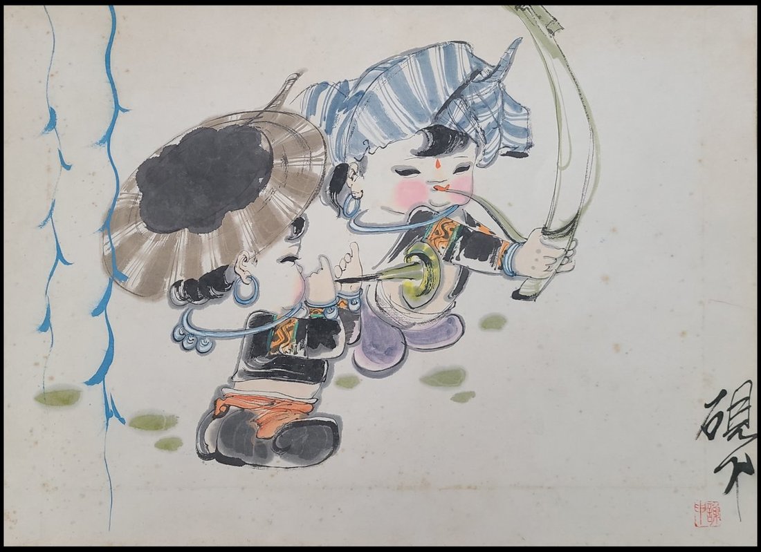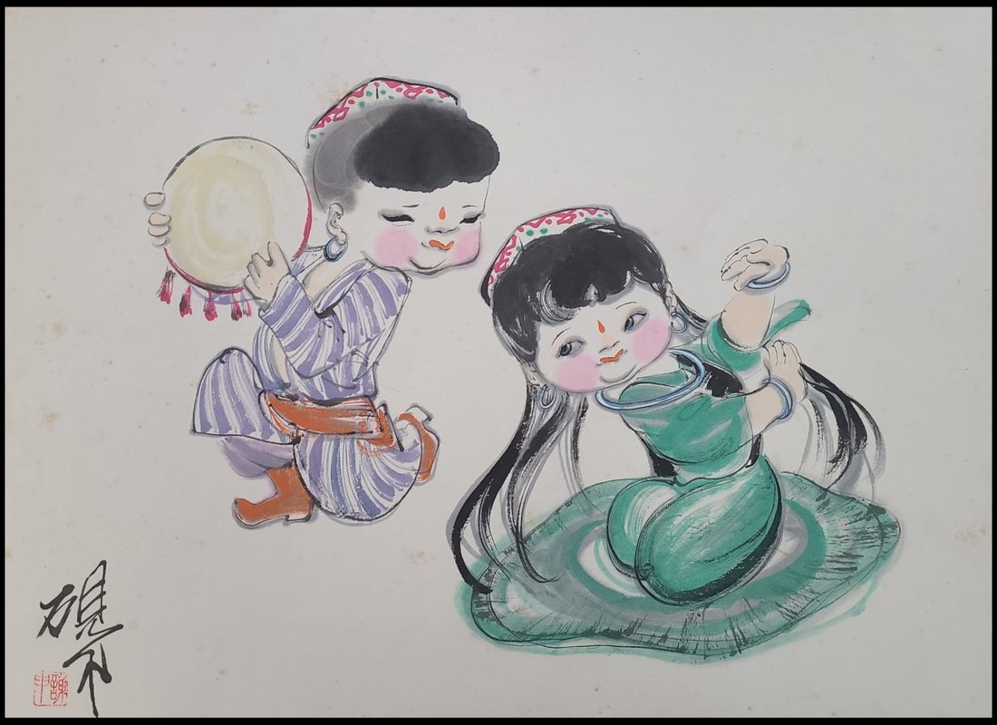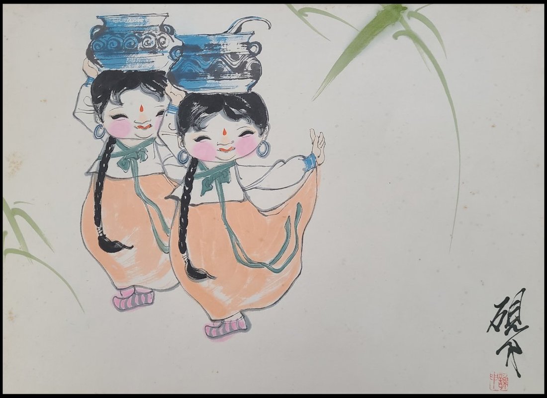 1980s nine works of Xie Shen (1942-2019) children's figure paintings, seal "Xie Shen", style: Yan Yu. There are yellow spots on some painting. Format size 41x56cm each