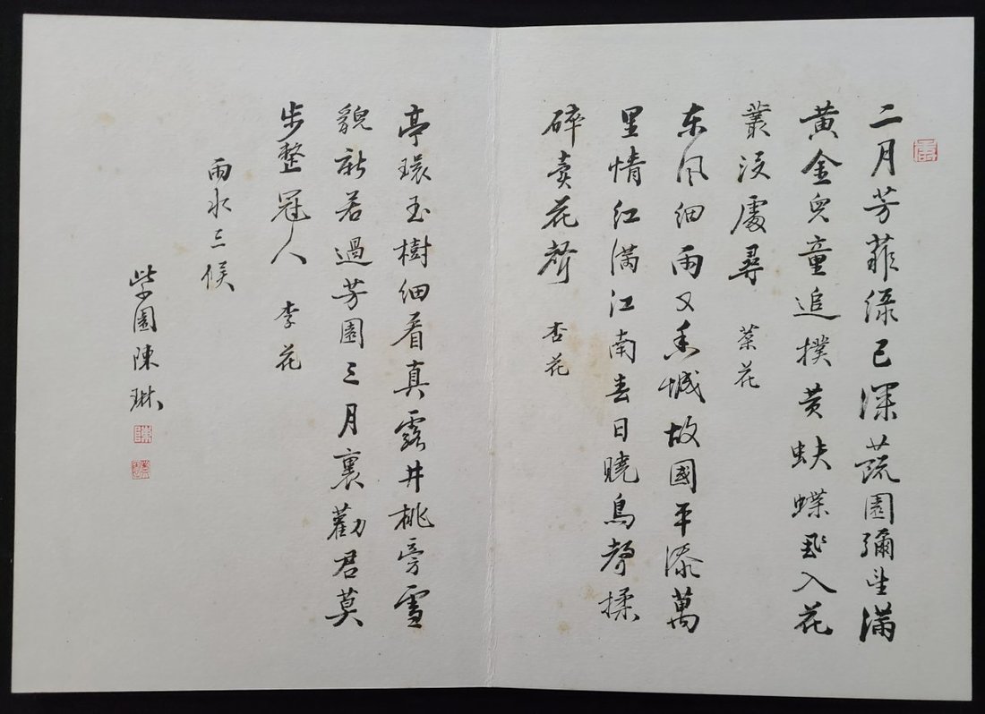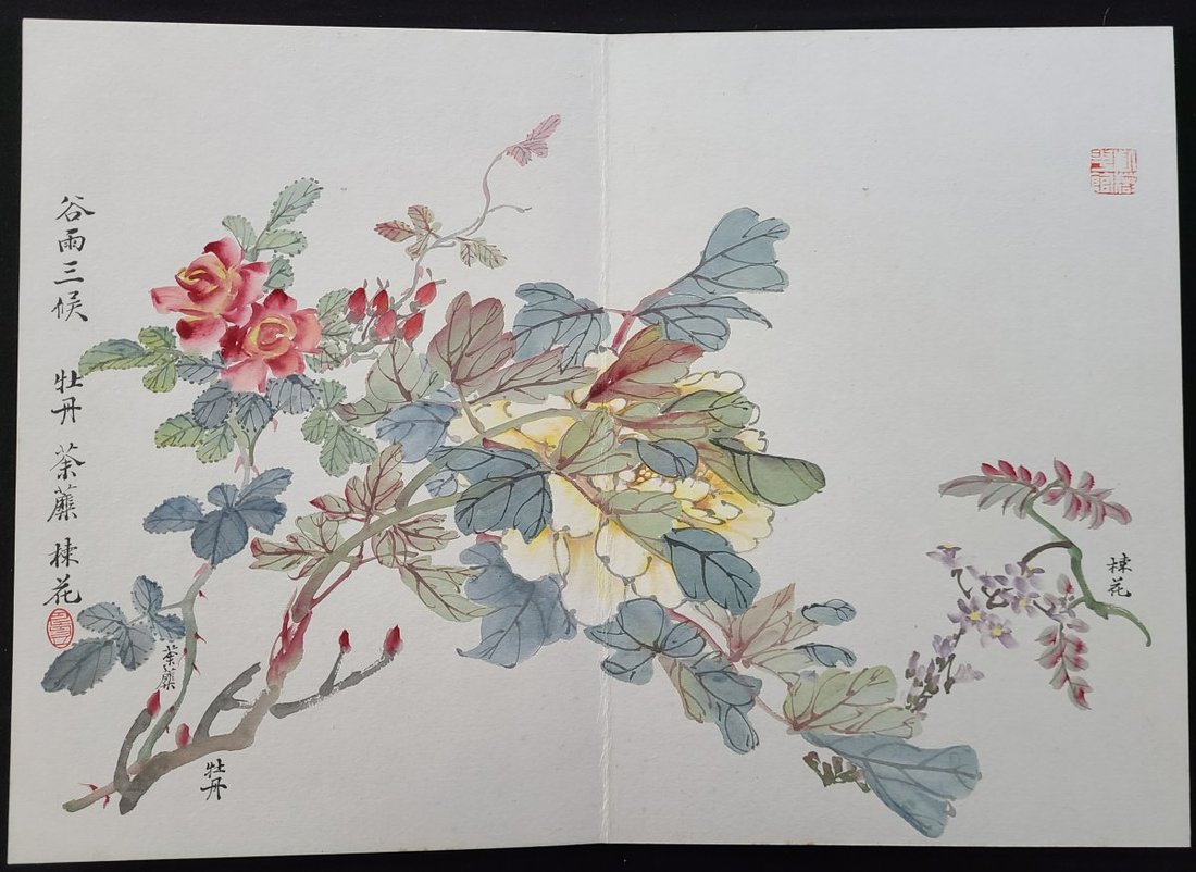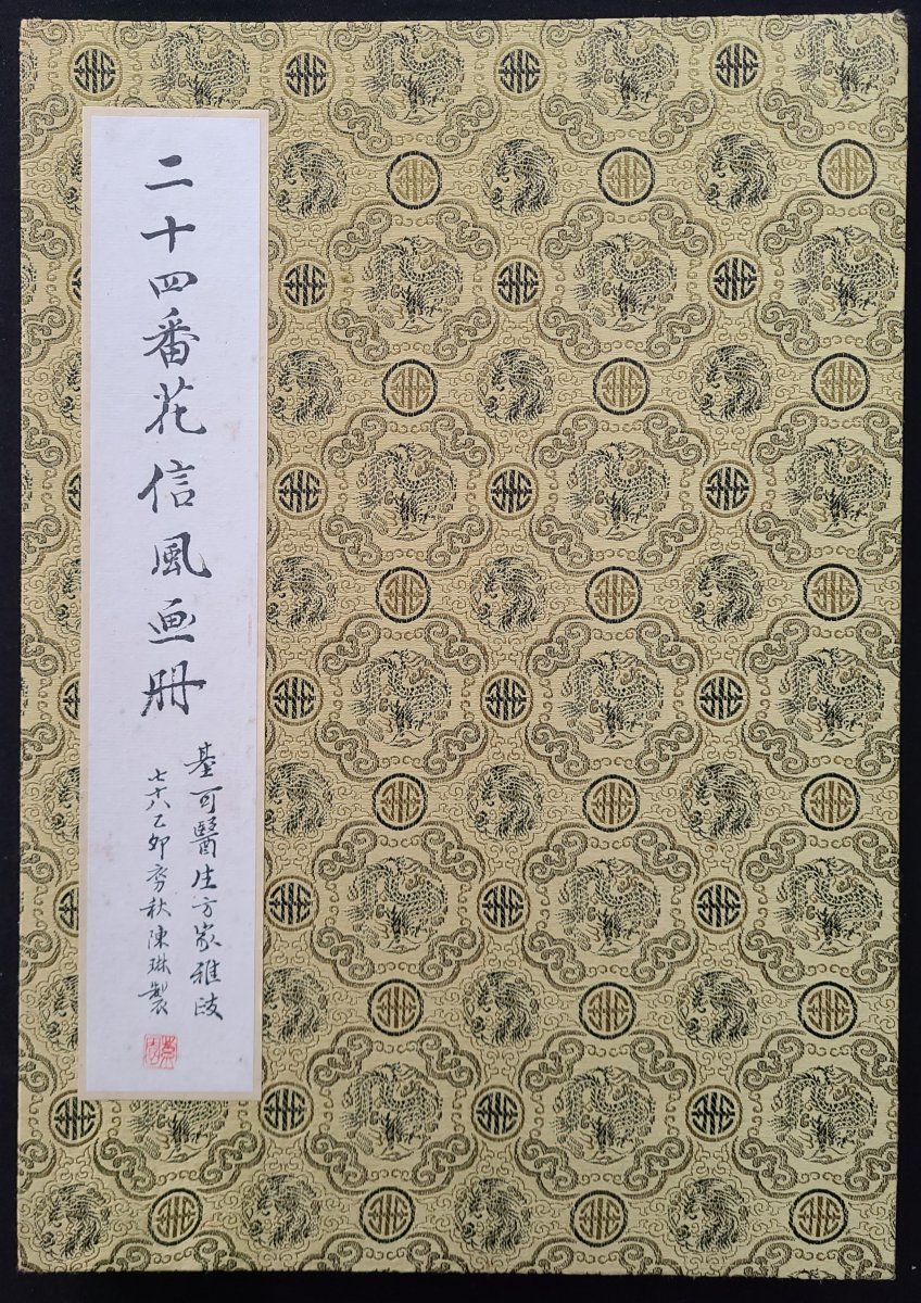 陳琳 (1914-2002) "二十四番花信風畫册", 紙本設色. 封面簽紙題式: "基可醫生方家雅政 七十八乙卯(1975) 初秋 陳琳製, 鈐印: 紫園". 紙本設色, 錦面經折裝, 九折八面繪花卉, 首有陳琳自識, 背八面為各花題詠. 畫册內鈐印有: "紫園" "陳琳" "紫薇花館" "人長壽" "陳" "壽" "陳氏" . 畫册尺寸: 26.8x38.5cm, 畫幅尺寸: 37.8x53cm. 紫園陳琳為李鳳公的傳人.