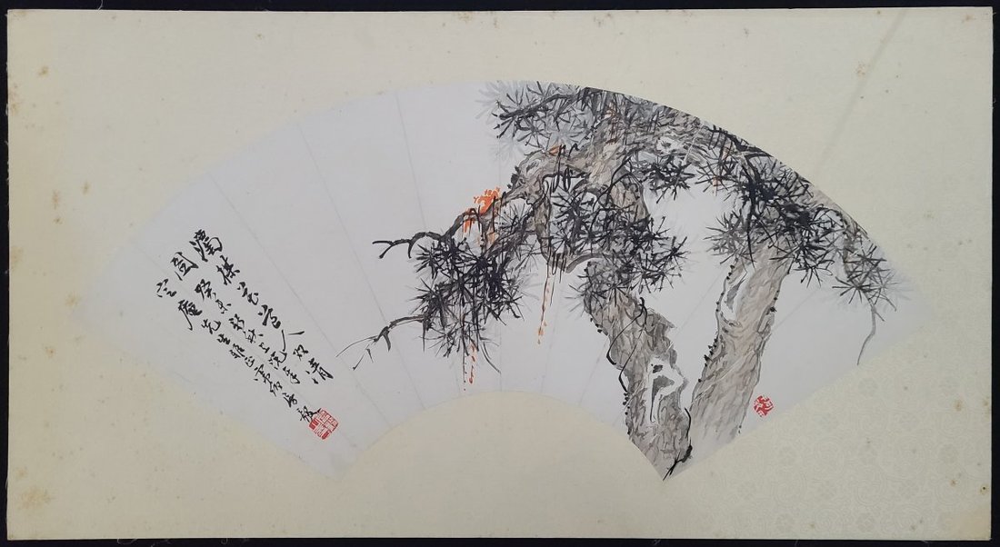 Fang Yi (1889-1979) "Double Pine" painted on fan, painted in 1943. Painting size: 25x54cm