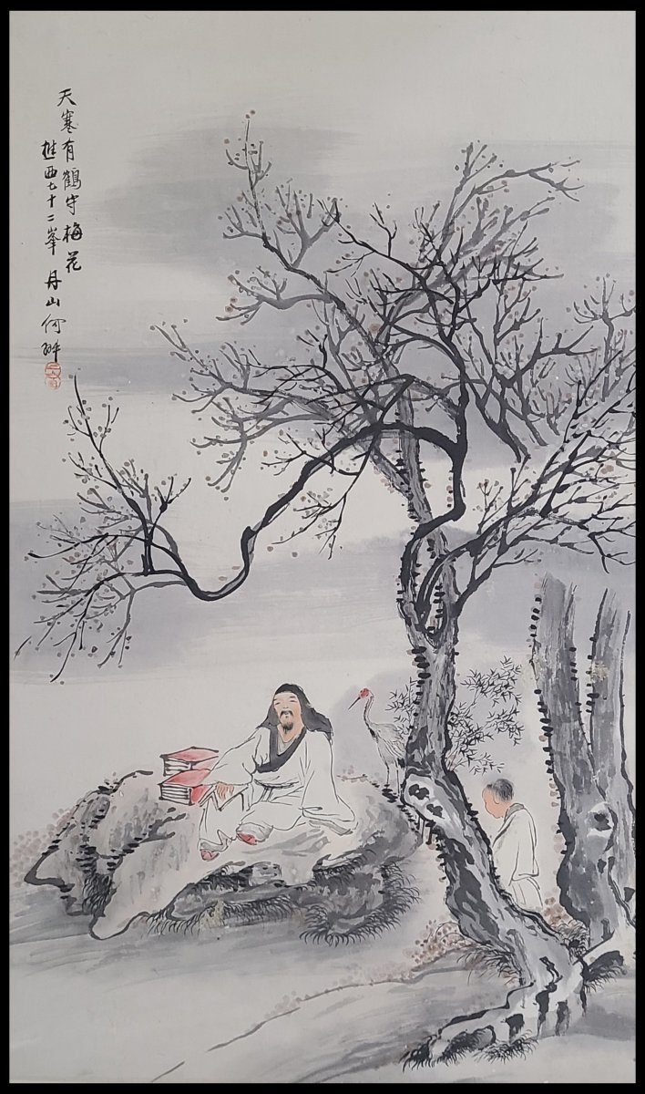 何翀 (款) 人物鏡心, 題識: "天寒有鶴守梅花", 設色水墨. 款式: 樵西七十二峯 丹山 何翀. 鈐印一枚. 畫幅尺寸: 31x51cm