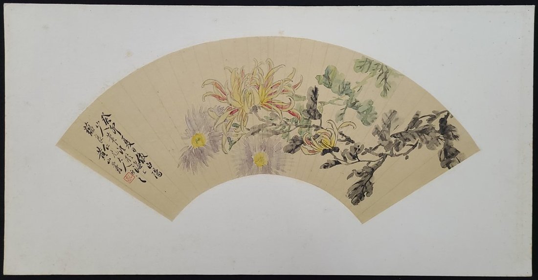 黃山壽 (1855-1919) "秋菊" 扇面, 紙本設色. 題識: "癸卯 (1903) 夏日仿白陽山人筆法於海上". 款式: 蘊良仁兄大人正之 黃山夀. 鈐印: "山壽". 畫幅尺寸: 22.5x51cm