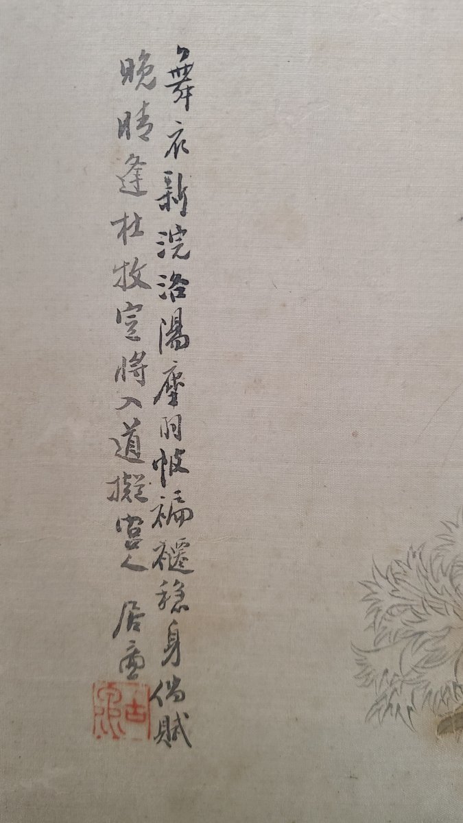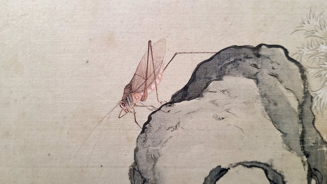 居廉(1828-1904) 蟲石花卉. 設色絹本 鏡心. 題識: "舞衣新浣洛陽麋 羽帔褊褼稳儅 賦晚晴逢杜牧 定將入道擬宫人". 款式: 居廉. 鈐印: "古泉". 畫幅尺寸: 27x40cm
