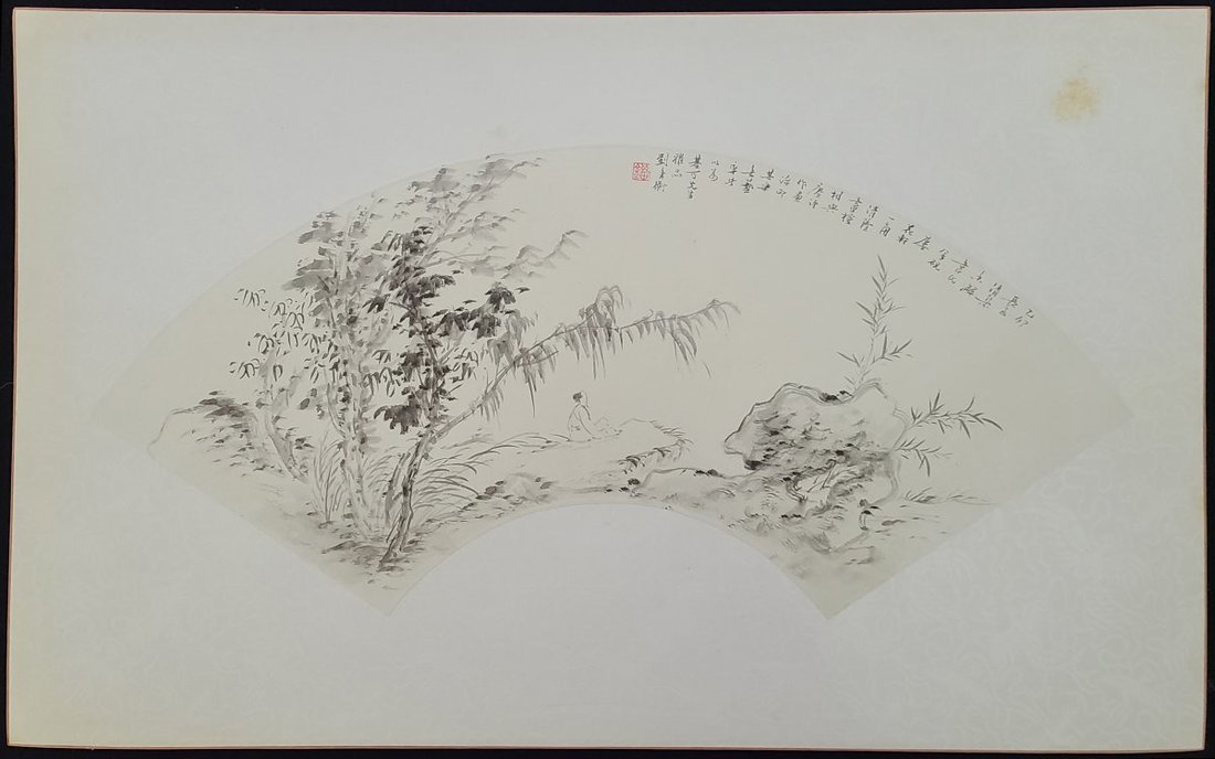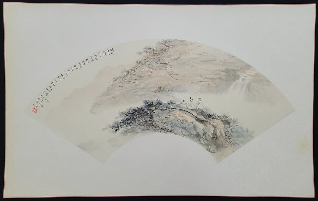 劉秉衡 (1915-2003) 題字及寫畫扇面各一幅, 紙本設色, 均乙卯 (1975) 寫於金硯廔, 其一為楊兆東寫聽泉圖, 由劉秉衡題字. 鈐印: "鎦". 畫幅尺寸: 24x52cm