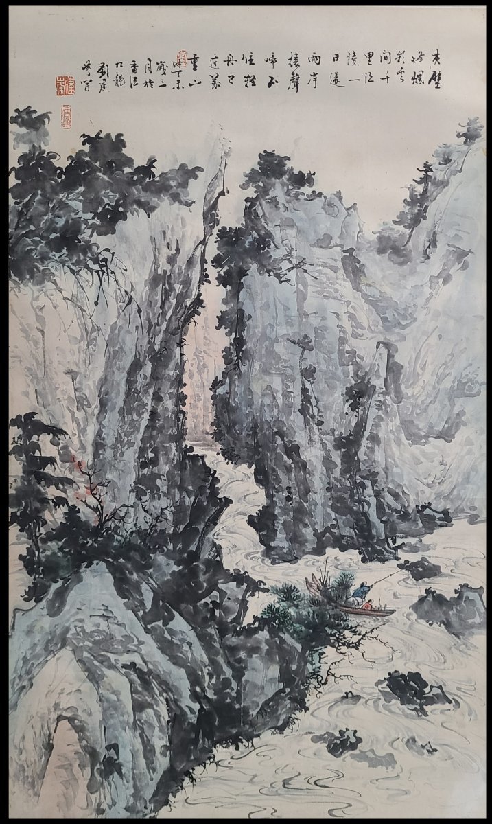 劉建峯山水畫立軸; 紙本設色. 題式: "夾壁烽烟彩雲間 千里江陵一日還….". 款式: 時丁未歲三月於香江九龍劉建峯寫. 鈐印: "劉" "建峯". 畫幅尺寸: 38.5x65cmcm
