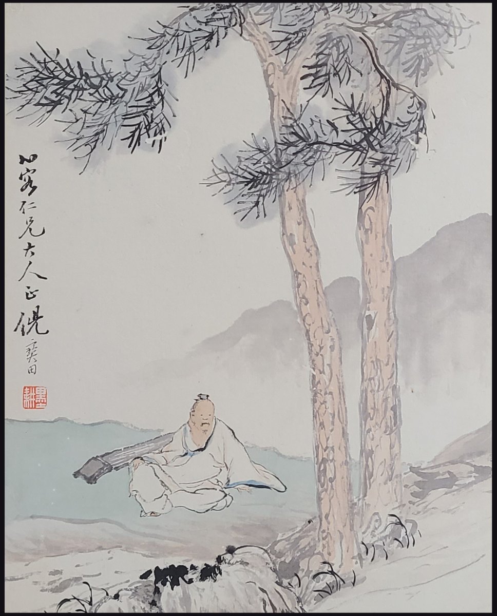 Ni Mo Geng (1855-1919) "The old man and the guqin under the pine tree". Painting size: 24x30cm