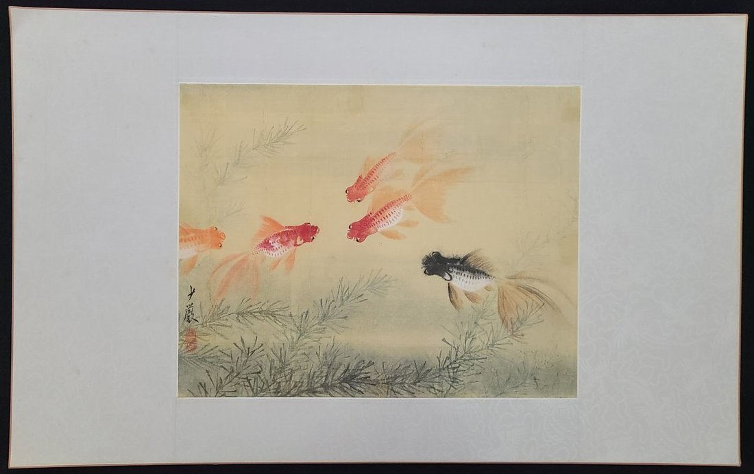 歐少嚴 (1942-) 金魚水藻圖. 紙本設色, 鏡心. 款式: 少嚴. 鈐印: "少嚴". 畫幅尺寸: 26x33.5cm