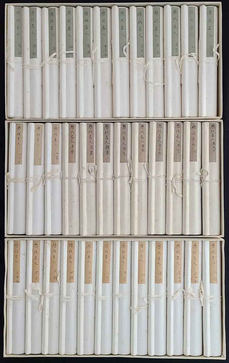 "Portrait of Famous People in Past Dynasties". Painted by Zhang Qianhua in 1964. Total of 36 hanging scrolls (23x111cm each). Stored in three carton boxes.