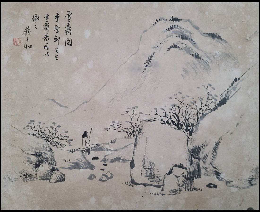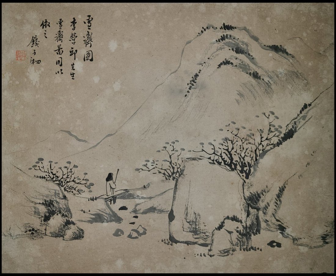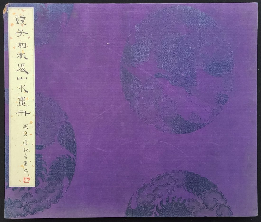 錢子湘 (清末人)水墨山水畫册, 畫册題簽為羅叔重筆. 綢面經折裝, 內裱紙本水墨畫共八幅. 鈐印 "子湘", "竹坡". 藏印: "雅齋珍藏". 畫册尺寸: 32.5x38.5cm, 畫面尺寸: 27.5x33.5cm