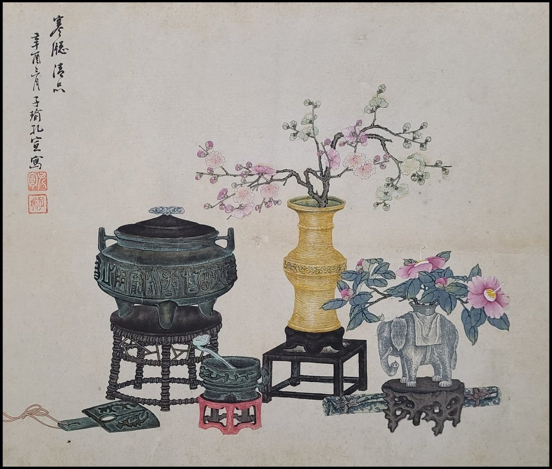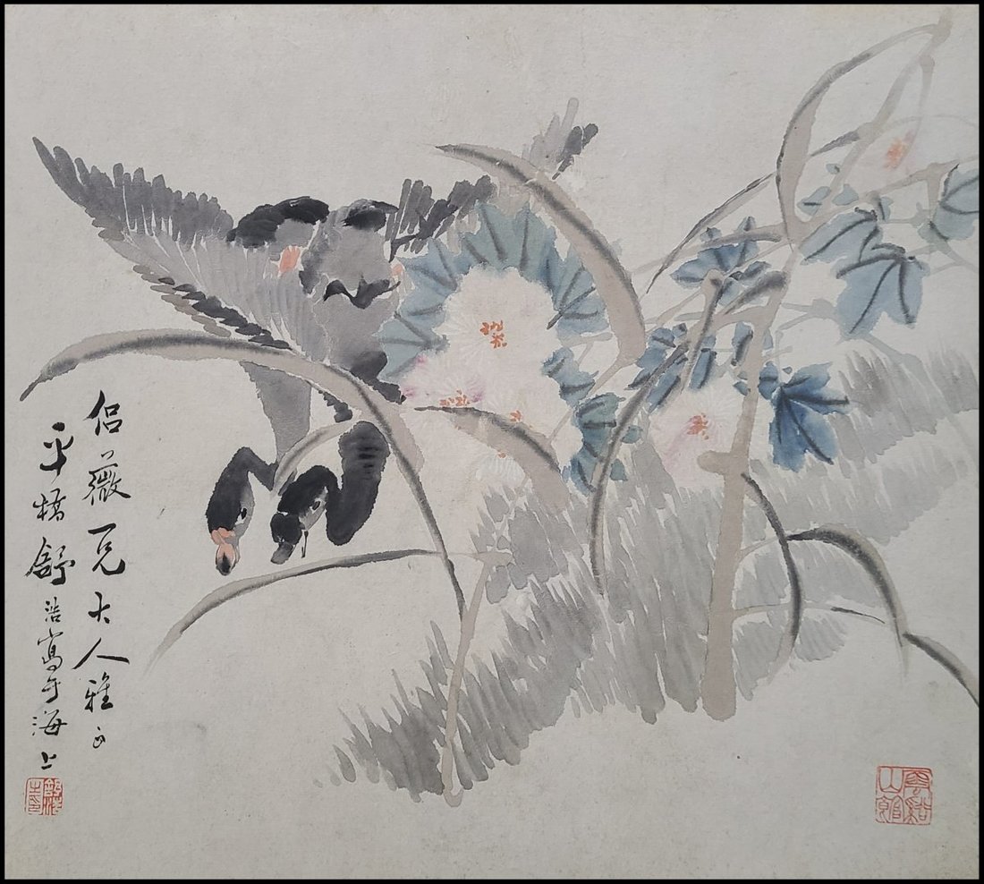 清未畫家繪山水及花鳥畫十種册頁, 紙本設色, 絹面經折裝. 畫家包括: 陳梓琴 ("擬米襄陽煙雨", "山雨欲來風滿樓"), 徐祥 ("花鳥" 兩幅), 朱偁("花鳥"及"鷄"), 孔宣 ("寒窗清品"), 舒浩("花雁圖"), 胡之森 ("墨竹圖") 及蝸寄生王禮(縮摹北宋畫意圖")等.