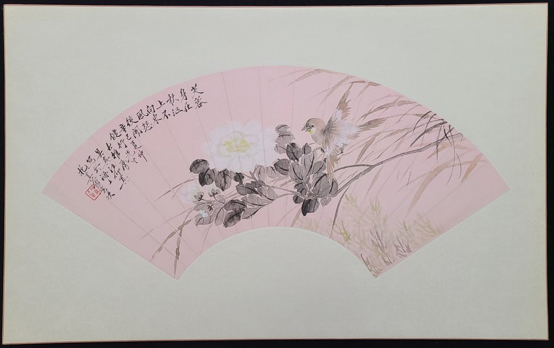 Wang Yang Zhen, flower and bird painting on fan. Painting size: 23x52cm