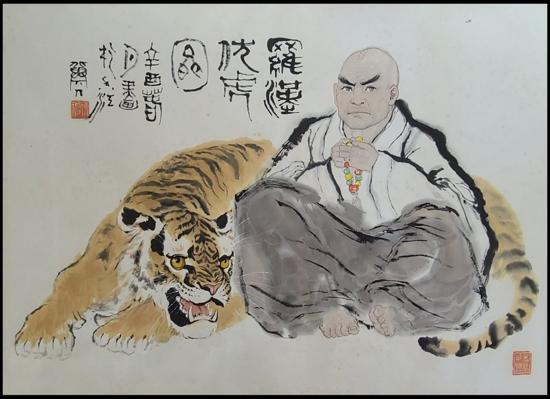 吴曾亮人物畫, 未裱, 紙本設色; 題識: "羅漢伏虎圖". 款式: 辛酉(1981)春月畫於香江冀人. 鈐印: "傳神" "曾亮即興", 畫面尺寸:62x87cm
