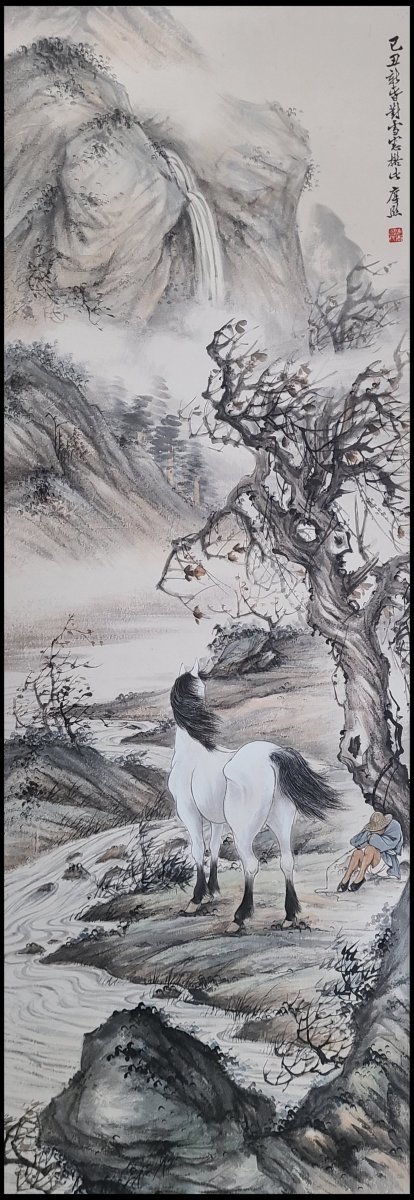 Zeng Hou Xi "The Picture of Resting Horses Under the Waterfall". Painting size: 40.5x116cm