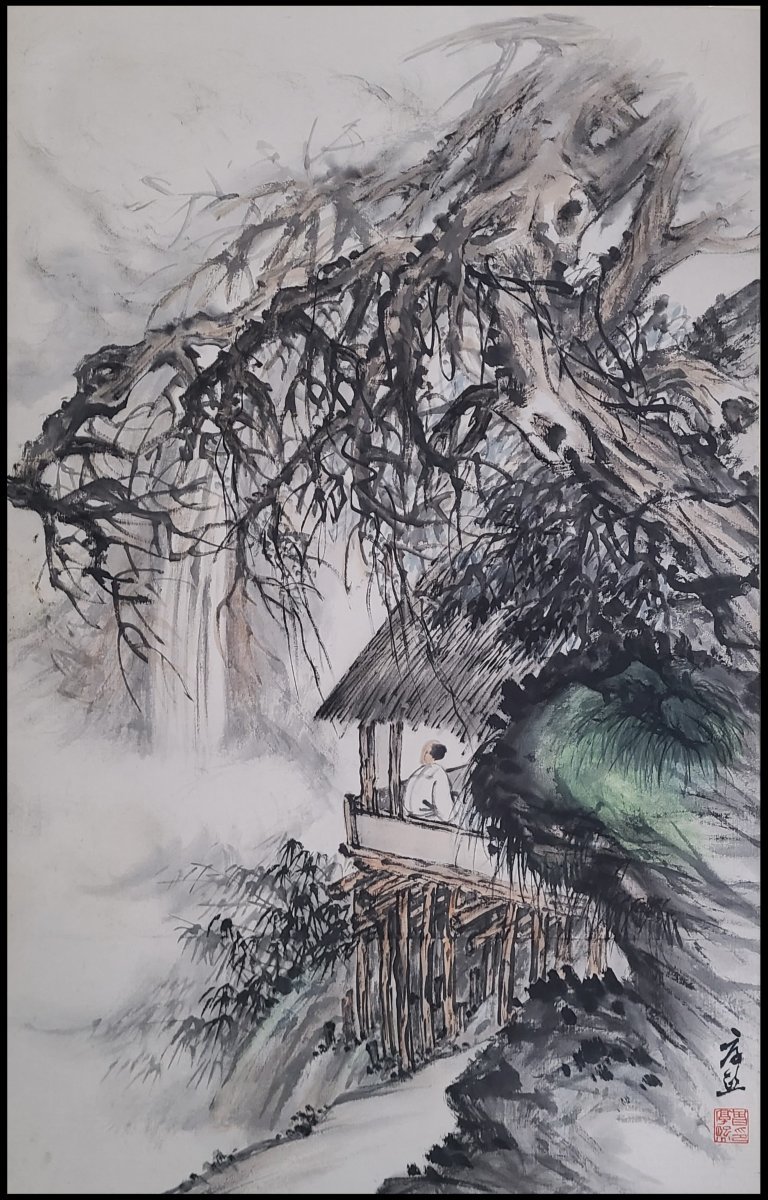 Zeng Hou Xi "Viewing Waterfall under the Tree". Painting size: 44.5x70cm
