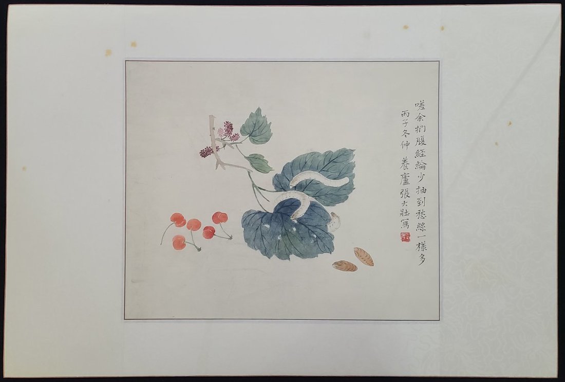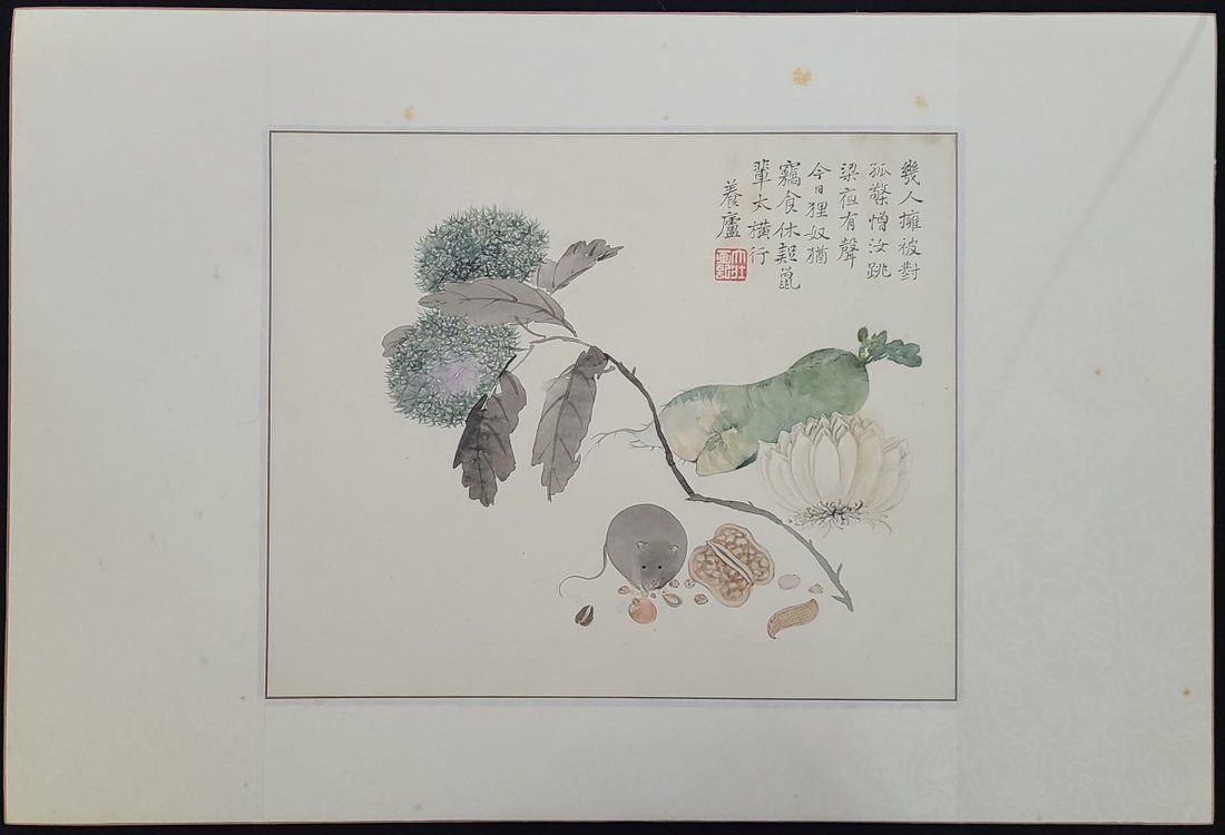 Zhang Da Zhung (say) two works of "Vegetables, silkworms and rats". Painting size: 27.5x33.5cm each. Sold as is.