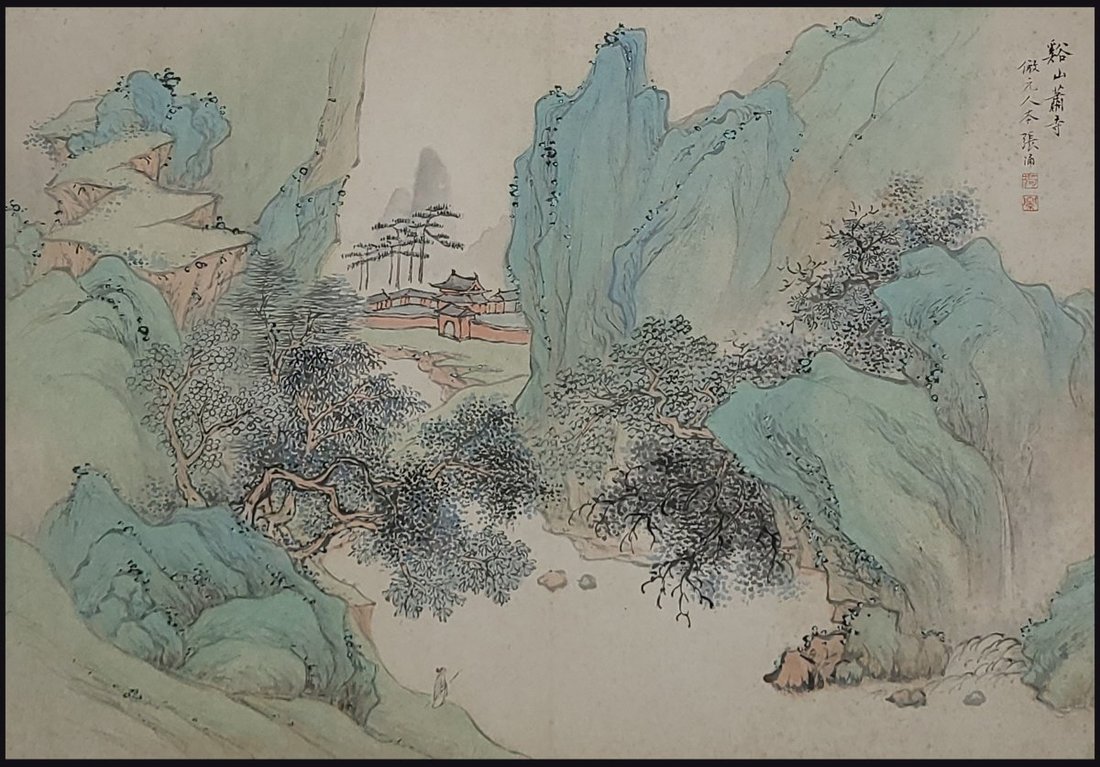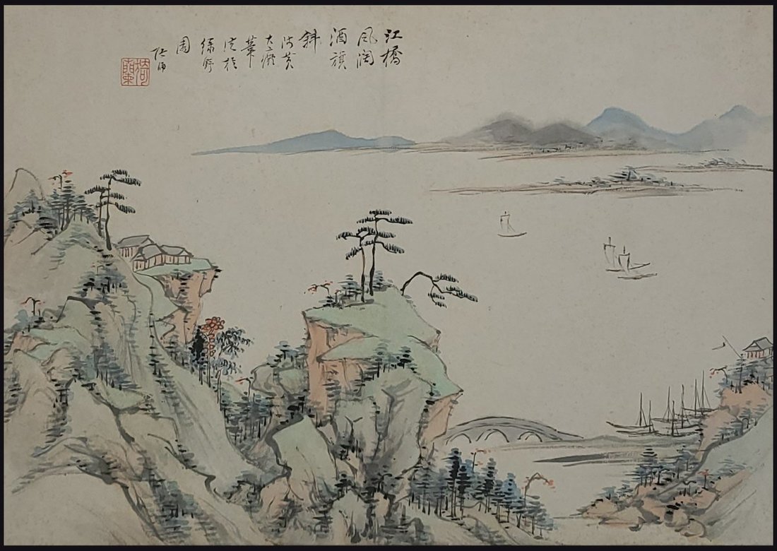 張猗蘭(張涌, 清中期人) 山水畫册, 紙本設色十二幅裱於經折裝畫册, 各幅題式為:1/ "谿山簫寺", 2/ " 張公洞圖", 3/ "秋江少媍", 4/ "江橋風闊酒旗斜", 5/ "五月江深草閣寒", 6/ "溪穚散步逢詩客", 7/ "倣郭河陽寒林山水", 8/ "擬楳花庵主", 9/ "辛亥八月小窗晨起….", 10/ "一路寒山萬木中", 11/ "夏日….", 12/ "思翁學米….". 款式有: "張涌", 猗蘭涌", 鞠後生", "壺天外史", "雲道人"等. 鈐印: "猗" "蘭" "猗蘭" "張涌私印" "涌印" "猗蘭書畫"等. 畫册尺寸: 38x53.5cm, 畫面尺寸: 32x45cm