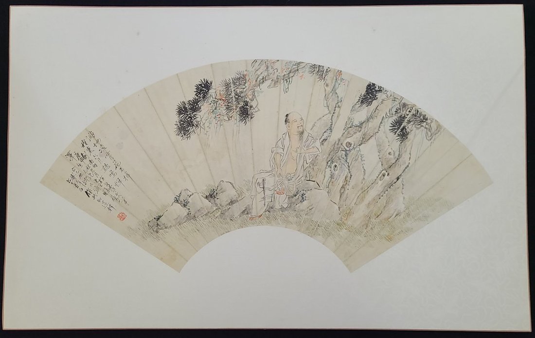 Zhen Zhao Han (1855-1941) "An old man under the pine tree" painted on fan. Painting size: 22.5x52.5cm