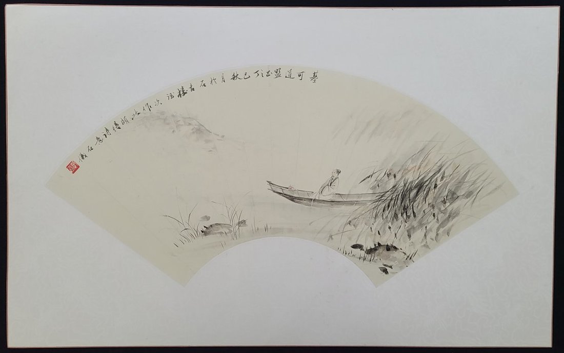 Zheng Shi Yi, "old man on boat on the river" painted on fan. Painting size: 24x52cm