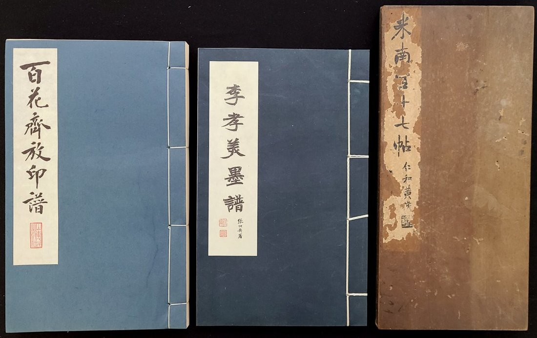 1909年(光緒己酉) 刊"米南宫十七帖" 珂羅版經折裝, 有木夾板; 另有1978年版線裝"百花齊放印譜"一册及翻印"李孝美墨譜一册.